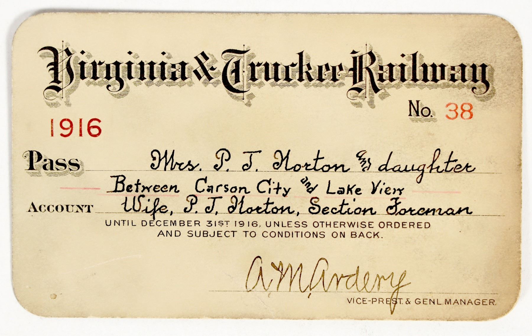 Rare 1910s pass. Pass no. 38, issued to Mrs. PJ Horton & daughter, wife of section foreman. Under the name, it mentions this is for "Between Carson City and Lake View." The Lake View stop was in Washoe County between Washoe and Eagle Valleys. This pass is signed by AM Ardery as vie president and general manager. Signed on the back by Mrs. Horton. Printed on cardstock. Soiling.