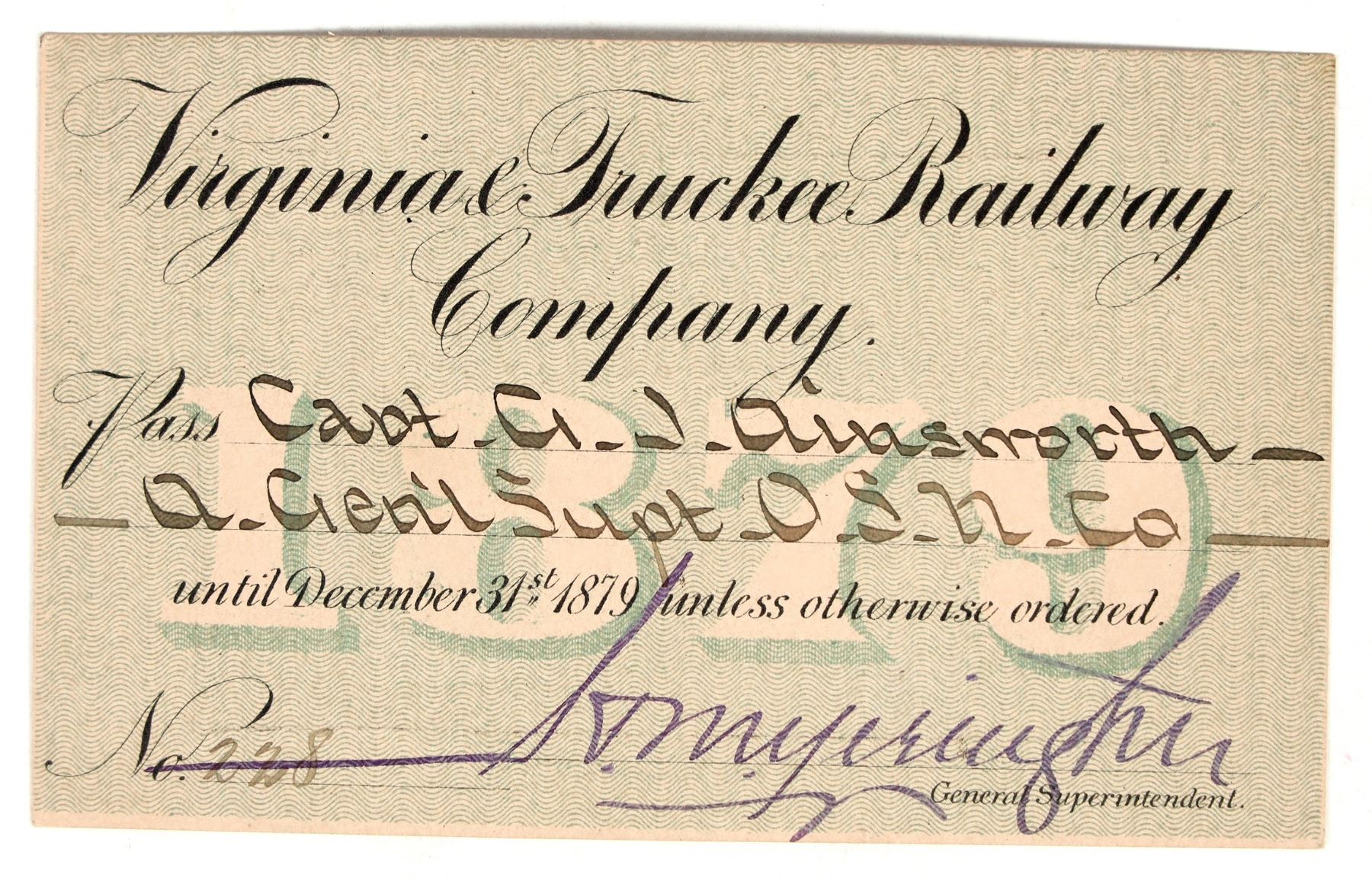 Extremely early pass; very tough to get an 1870s pass for this railroad! Pass no. 228, issued to Capt. AJ Ainsworth, asst. general supt. of the OSN Co. Signed by Henry Yerington as general superintendent. Black and white print on green cardstock. Paper residue and adhesive on reverse. See photo. The Virginia & Truckee Railroad was incorporated in 1868 by William Sharon of the Bank of California to transport Comstock Lode ore and timber between Virginia City and Carson City, with the 21.5-mile route completed in 1870 under the supervision of Henry M. Yerington. In 1872, a 31.5-mile extension was completed to Reno, linking the line with the Central Pacific Railroad and transforming the V&T into a vital commercial artery for the mining economy. At its peak, the 52-mile short line hauled freight and passengers for major operations like the Consolidated Virginia, Chollar-Potosi, and Gould & Curry mines, earning a reputation as one of the most profitable and picturesque railroads in the American West before shutting down in 1950. It is possible that they meant JC not AJ Ainsworth. Capt. JC Ainsworth founded the OSN and his son George served as supt.