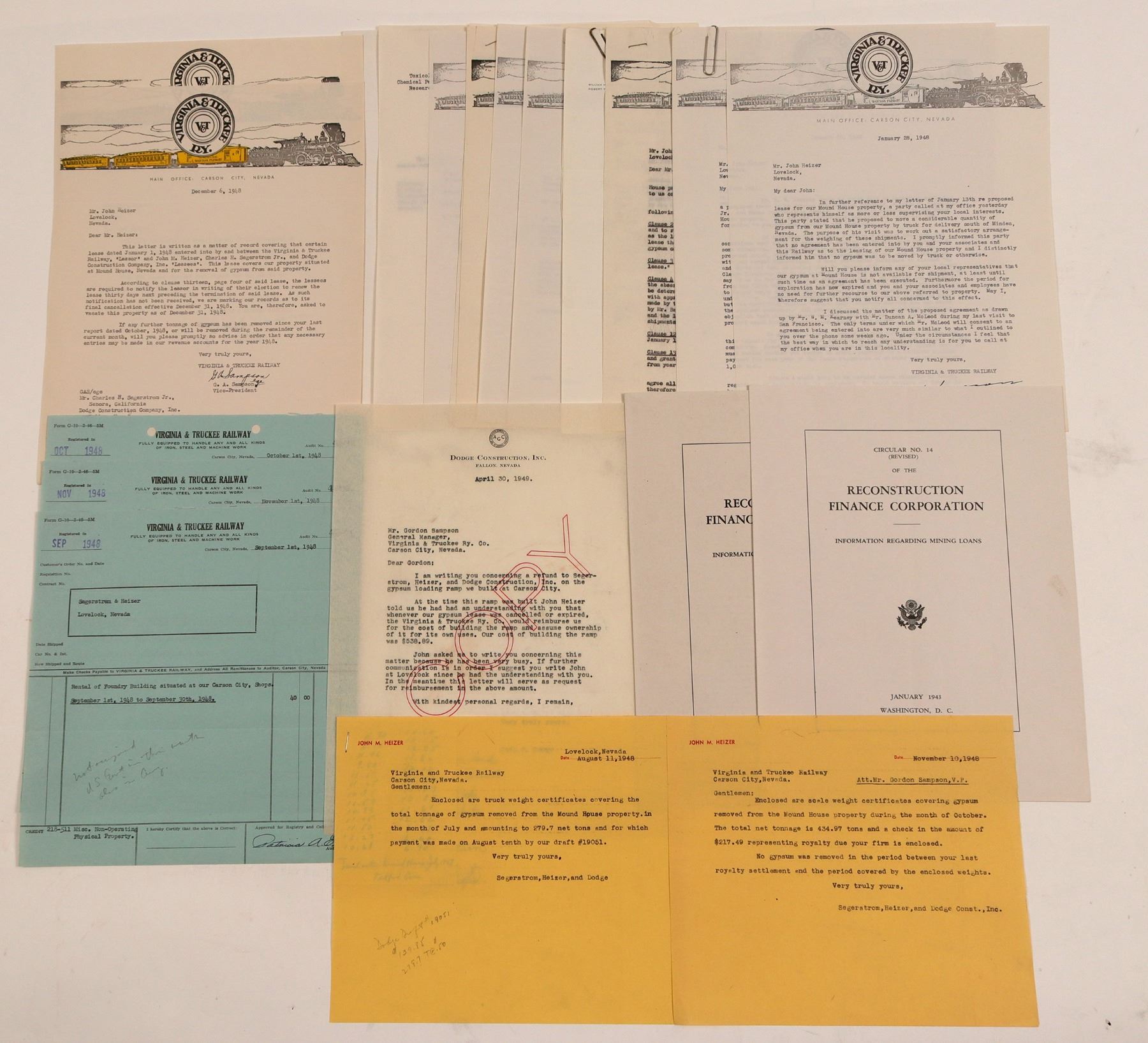Lot of 20 or so pieces. Most are 1948 letters typed on Virginia & Truckee Railway, Carson City, pictorial letterhead addressed to Nevada mining engineer John Heizer in Lovelock. The main topic seems to be the gypsum at the Mound House property of the railroad. Most of the letters are from V&T vice president GA Sampson. Also receipts for rental of the Foundry Building at their Carson City shops. Two messages from Heizer to the V&T regarding tonnage of gypsum moved. Also two booklets about mining loans (1943 and 1944) from the Reconstruction Finance Corporation. At the turn of the 20th century, there ere two gypsum operations at Mound House: the Regan Mill and the Adams operation. In1904, former Nevada Governor Jewett W. Adams acquired the northern gypsum deposit. Gypsum was transported via the SPRR and by large carts to the old Mexican mill for refining in Empire City, Nevada. Adams named his product "Empire" plaster. Empire brand plaster was used in the rebuilding of San Francisco after the 1906 San Francisco earthquake. In 1907 Adams, J.C. Curry and Nathaniel Bell formed Nevada Gypsum Co., which started construction of a new mill and tramway just north of Mound House on the V&T.Heizer Estate