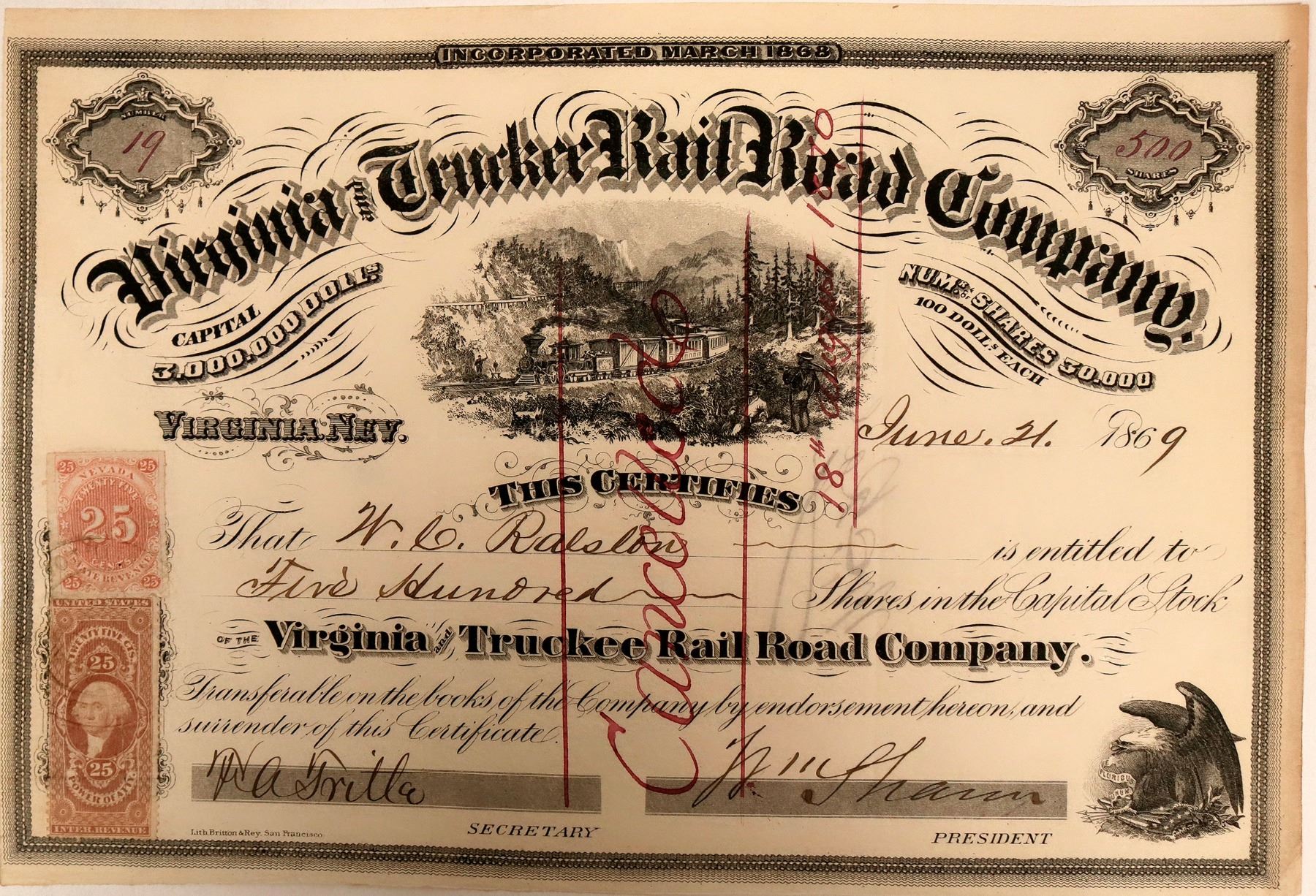 Incorp 1868 Nevada. Bank of California Nevada agent, William Sharon (Wm. Sharon), would foreclose upon the mines or mills when their owners defaulted on payments. Sharon, along with business partners Darius Ogden Mills and William Ralston, formed the bank-owned Union Mill & Mining Company to process the ore from the mills. Sharon envisioned a railroad to run from Virginia City, through Gold Hill passing the mills along the river, ending at the state capital, Carson City. It covered 21 miles, descend 1,575 feet of elevation and have so many curves as to make 17 full circles in the thirteen and a half miles from the river to Virginia City. #19, I/C, 500 shares @ $100 ea. ($1.4 million today) issued to W.C. Ralston June 21, 1869 signed Wm. Sharon President. Black, no seal, vignette 4-4-0 passenger train rounding curve r-l, lower right small eagle facing r-l (E. Pluribus Unum banner). Two revenue stamps. Note : it says Virginia, Nev. Britton & Rey printer. EF