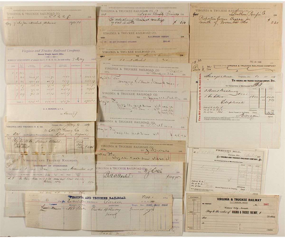Lot of 15. Nice group that shows a variety of typical expenses for the railroad. 1) 1880. V&T way-bill for transport of barley from Reno to Carson. Light water damage. 2) V&T Railway Carson City check. Later. Blank. #3667. S.C. Bigelow as receiver. 3) 1870s, Carson, Nevada. Freight bill for V&T for transport from SF. 4) Ten V&T vouchers: 1876; Freight bill attached to Savage Mining voucher for transport of boxes of machinery; 1879, H.S. Crocker; 1880, hauling; 1880, Carson; 1882, Carson, JW Wade for cast iron; 1883, Lyon County Times for advertising annual meeting of VTRR; 1883, Virginia City; 1899, H.S.Crocker Company for stationery; 1900, printing; 1900, Southern Pacific Co. for proportion excess baggage for month of November. Most endorsed by Yerington. 5) 1879. Freight voucher attached to statement of overcharge. Consolidated Virginia Mining Company. Freight transported from Reno to Virginia City. Endorsed by Bender and Yerington. Glue damage and soiling. 6) 1883. General Freight Agent Office voucher attached to V&T voucher. Statement of amount due for freight charges to Central Pacific Railroad Company.