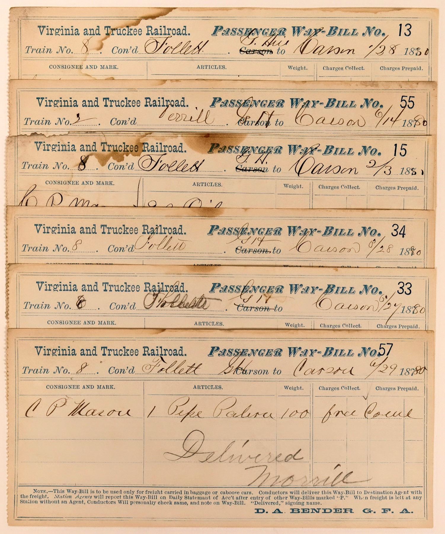 This is a lot of Virginia and Truckee Railroad (V & T RR) passenger way-bills; a total of six receipts dated from 1880 delivered between G.H. (Gold Hill) to Carson City and signed delivered by Mr. Morrill. These receipts make railroading in the Comstock come to life.