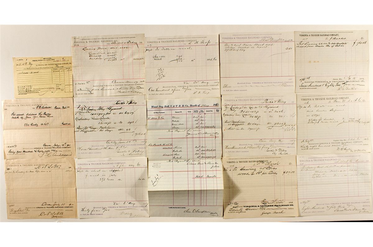 This is a lot of 14 documents regarding the transportation of wood via the V&T Railroad. With the growth of the Comstock, lumber and cord wood were in demand. The V&T served as the fastest way to transport these much needed supplies to the Comstock and surrounding areas. [REF: http://www.virginiatruckee.com/history/].City: County: State: NVDate: 1873-1901