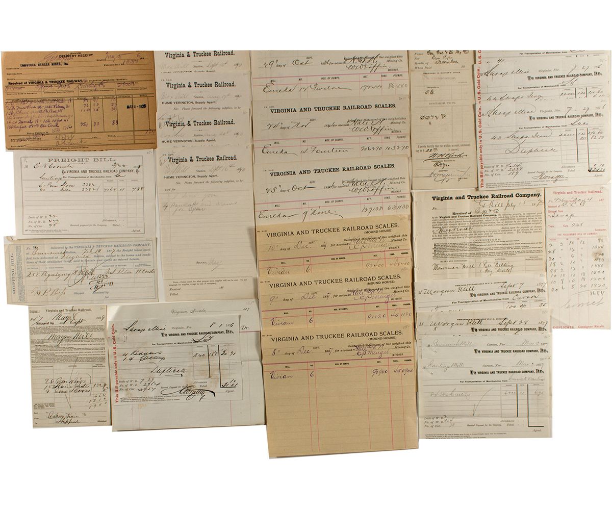 Lot of 26. Comprehensive group of shipping receipts and documents for the Virginia and Truckee Railroad that represent many of the Comstock Mills. 1) Two receipt stubs: 1892 small stub and 1870s larger stub for lumber shipped from Carson to VC for Savage Mining Company. 2) 1926 Gold Hill station delivery receipt for items shipped for Comstock Merger Mines, Inc. 3) Six Virginia and Truckee Railroad Scales receipts: three 1884 receipts for the Eureka Mill (by Hale & Norcross Mining Company), and three 1887 Mound House receipts for the Vivian Mill (by Hale & Norcross Mining Company). 4) 1877 blue shipping bill stub for wood transported to the Virginia station. 5) 1873 Gold Hill shipping document for delivery at the Merrimac Station (Carson River), Merrimac Mill (consignee). 6) 1878 Freight bill for Santiago Mill (Carson River). 7) Eight shipping bills: two for the Morgan Mill for goods shipped from Carson; one for the Brunswick Mill (from Carson); one for the Santiago Mill (from Carson); four for the Savage Mine (from SF), one of which is attached to a Savage voucher. 8) 1899 Shipping voucher for lengths of "old" pipes shipped by V&T for the Consolidated California & Virginia Mining Co. Attached to V&T voucher. 9) Four 1890 supply sheets for the Mexican Mill Station, with Hume Yerington (H.M. Yerington's son) as supply agent. 10) 1879 freight receipt for the Morgan Mill..City: Virginia CityCounty: StoreyState: NVDate: