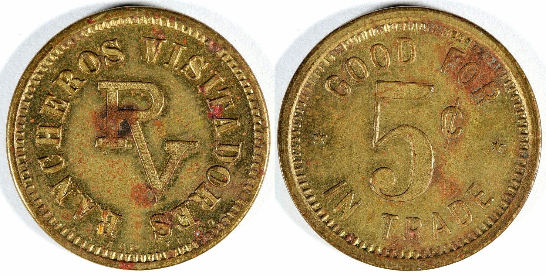 Obv.: Visitadores Rancheros / RV; Rev.: Good For / 5c / In Trade. Br., rd., 21 mm. Uncirculated.
