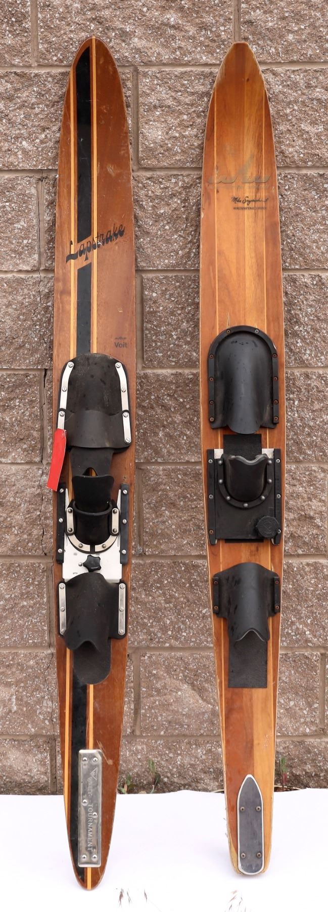 Two vintage and rare water skis. Voit Lapstrake 70”wooden ski in overall good condition. Western Wool 66”also used but in overall good condition. These would look great on the at antique Chris Craft boat.