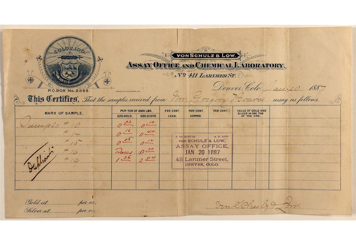 Very rare. Pretty graphic of a Colorado seal. Von Schultz & Low. Assay Office and Chemical Laboratory. No. 411 Larimer St. Denver, Colo. Jan. 20, 1887. Samples received from Gregory Board (?). Only the last of five samples was worth anything. Blue font. Signed by Von Schultz & Low. Condition: pinholes, toning, folds. Measures 10 3/4" x 6"City: DenverCounty: DenverState: CODate: