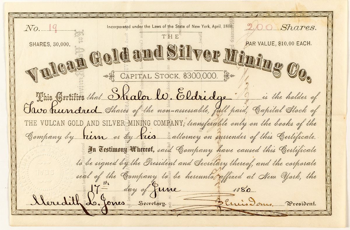 Cert. #19, issued to Shala W. Eldridge for 200 shares in 1880. Incorporated in New York. Signed by Lewis Jones as president and Meredith L. Jones as secretary. The company incorporated in 1879 in New York city. The company owned the Vulcan lode, 300 x 1500 feet; situated on the south slope of Potosi Mountain, 6 1/2 mi. sw of Ouray, Mt. Sneffles district. The lode was patented in 1879; vein a fissure from eight to twelve feet wide, pay streak 12 inches, containing galena with some brittle and ruby silver in a quartz gangue, milling when sorted on average fifty ounces of silver per ton. The Vulcan lode was developed by one tunnel 100 foot long on the vein and one fifteen-foot crosscut (Corregan and Lingane, 1883). In fine, uncancelled condition. City: Ouray State: Colorado Date: 1880 hwac# 35445