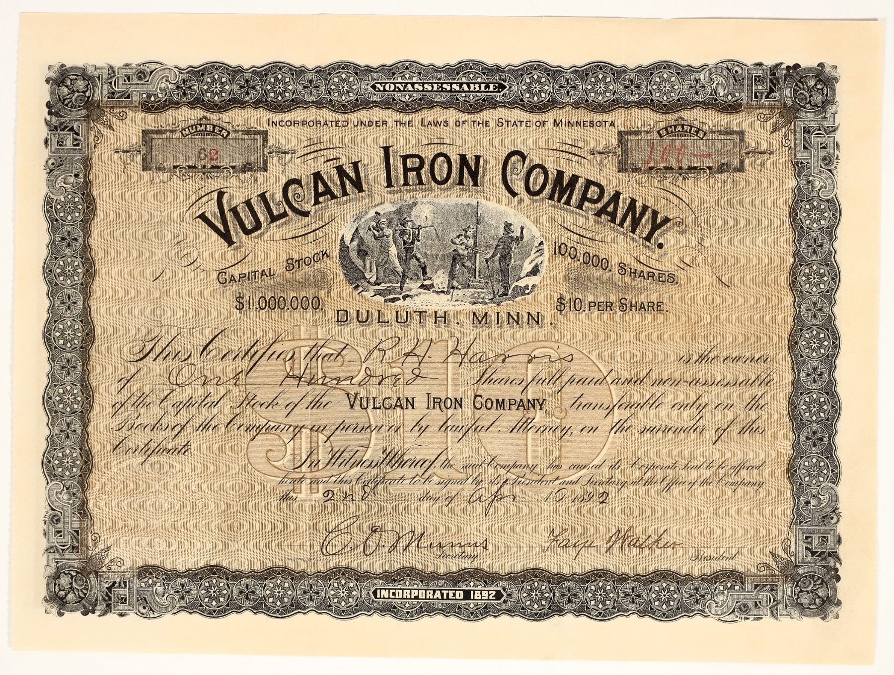 Inc. in Minnesota. No. 62, issued for 100 shares to RH Harris in 1892. Signed by president Walker and secretary Morris. Not cancelled. Black border and print, brown background, and underground mining vignette. Our consignor notes this company operated at Vulcan, Dickenson County, Michigan (E&MJ, Dec. 31, 1892, pg. 638). The name is quite common so we got a lot of hits on newspapers.com. A scarce certificate.
