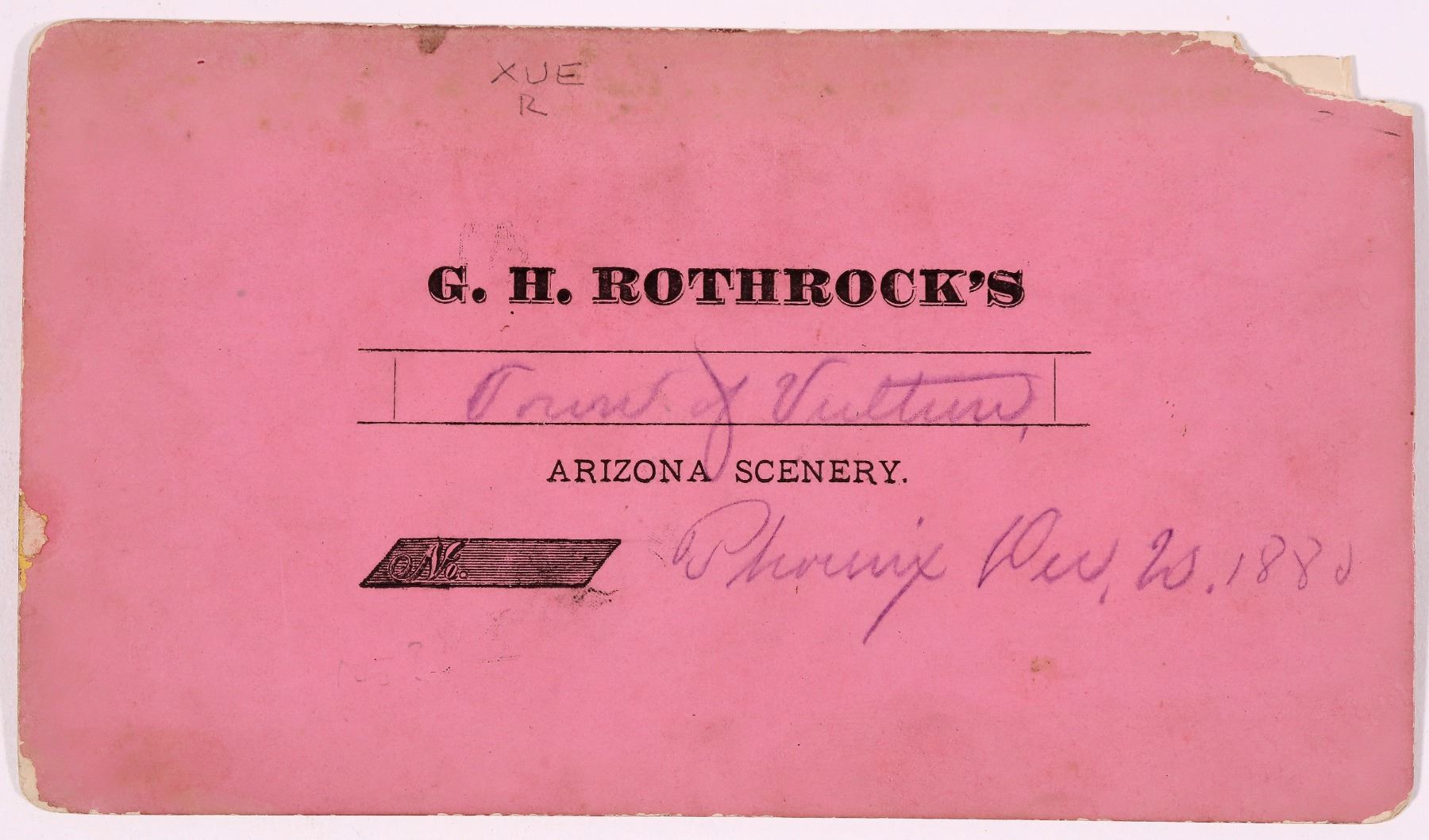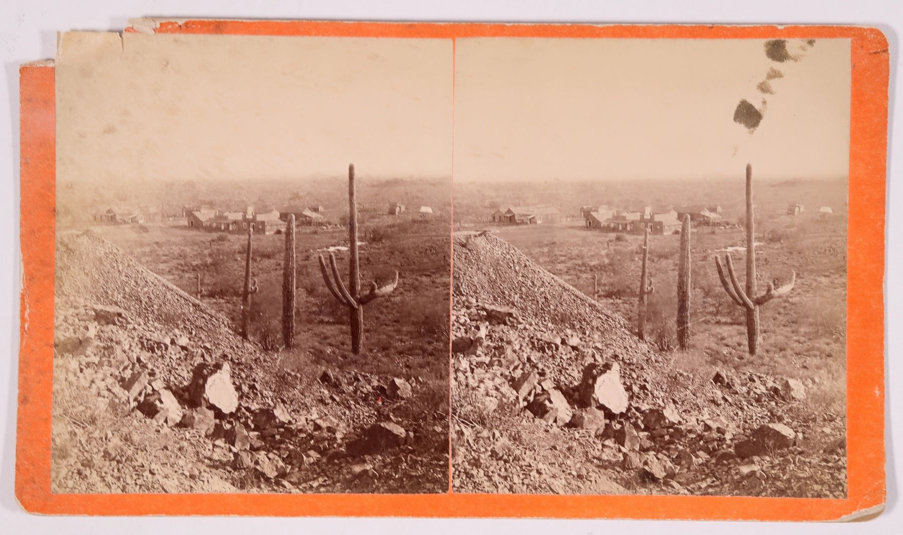 Early stereoview of Vulture by GH Rothrock, Dec 20, 1880. The mount has Rothrock's imprint on the back. The photograph is not numbered. Rothrock was a prolific Arizona photographer with an extensive history by Rowe in his book "Arizona Stereographs" 2014. The Rothrock family moved to California in 1854 onboard the brand new steamer SS George Law which later was renamed the SS Central America. The family was separated in Panama but were able to regroup. He travelled through mining camps of California and Nevada for nearly 10 years when he began partnering with a California photographer in the mid late 1870s he loaded a wagon with photographic supplies for Arizona and from there began photographing towns and mining camps. Some of his photos are the most historic known, and in many cases the first photographic representation of these places other than the Wheeler surveys. The Vulture mine was an important early discovery in Arizona and remains and important location today. The region was known for the shape of the rocks which resembles the outline of a vulture. This is thought to be one of only 3 known early views of Vulture.
