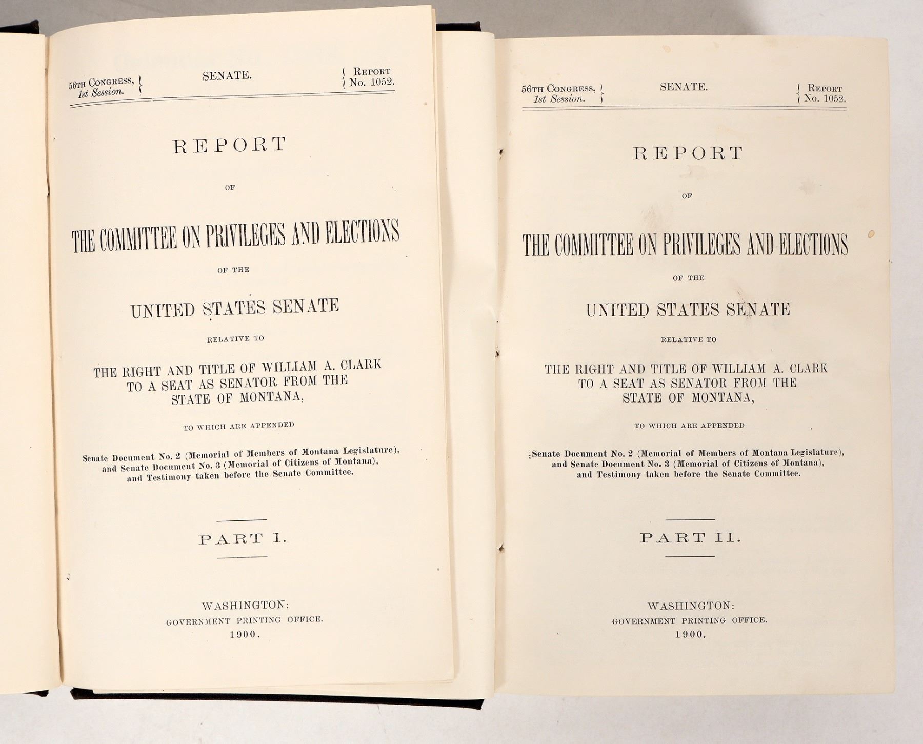 2 volumes, 1900 Report Relative to the right and title of William Clark to a seat as Senator from the state of Montana, by C B Nolan.