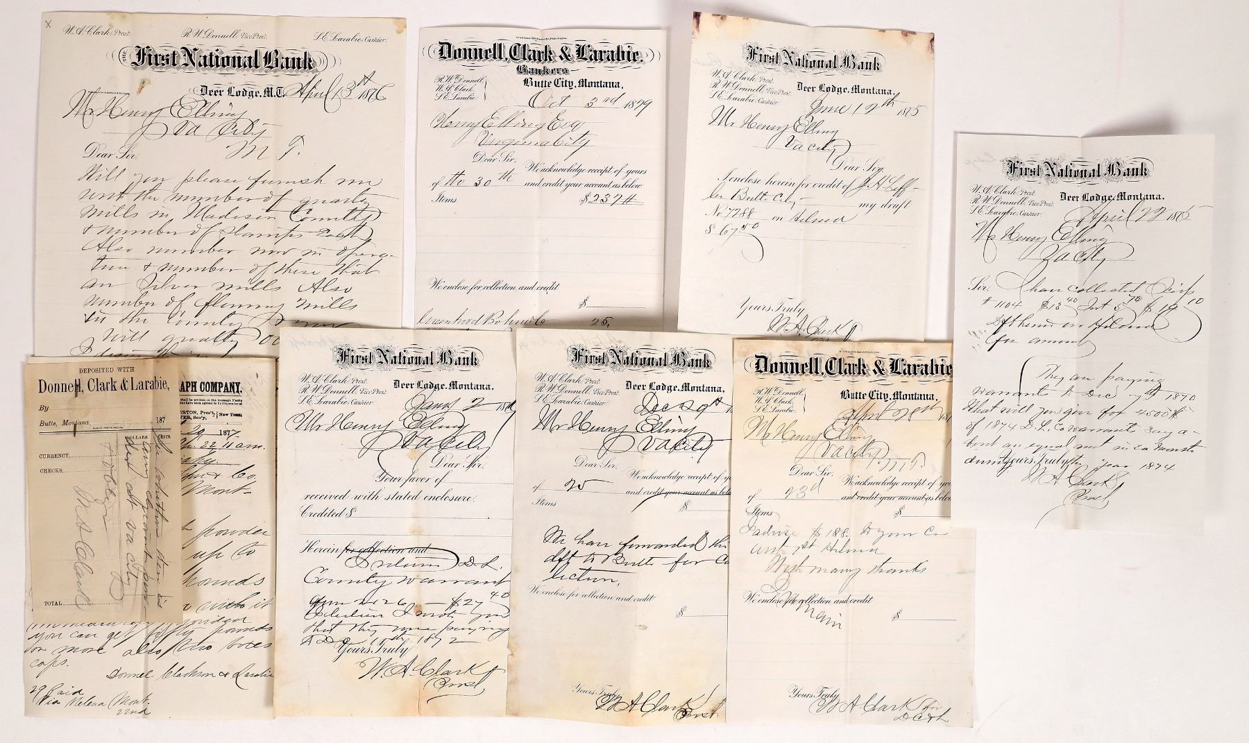 7 letters signed by W A Clark on First National Bank and Donnell, Clark & Larabie, Bankers documents. c. 1875-79. "William Andrews Clark Sr. (January 8, 1839 - March 2, 1925) was an American entrepreneur, involved with mining, banking, and railroads, as well as a politician. He became a banker in Deer Lodge, Montana. He repossessed mining properties when owners defaulted on their loans, placing him in the mining industry. He made a fortune with copper mining, small smelters, electric power companies, newspapers, railroads (trolley lines around Butte and the San Pedro, Los Angeles and Salt Lake Railroad from Salt Lake City, Utah to San Pedro and Los Angeles, California), and other businesses, becoming known as one of three "Copper Kings" of Butte, Montana, along with Marcus Daly and F. Augustus Heinze." from Wikipedia.