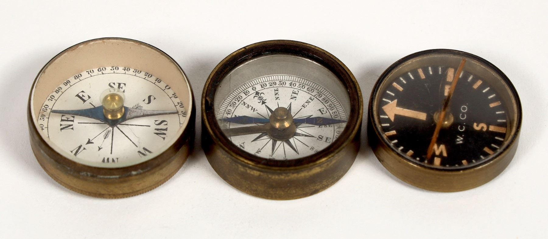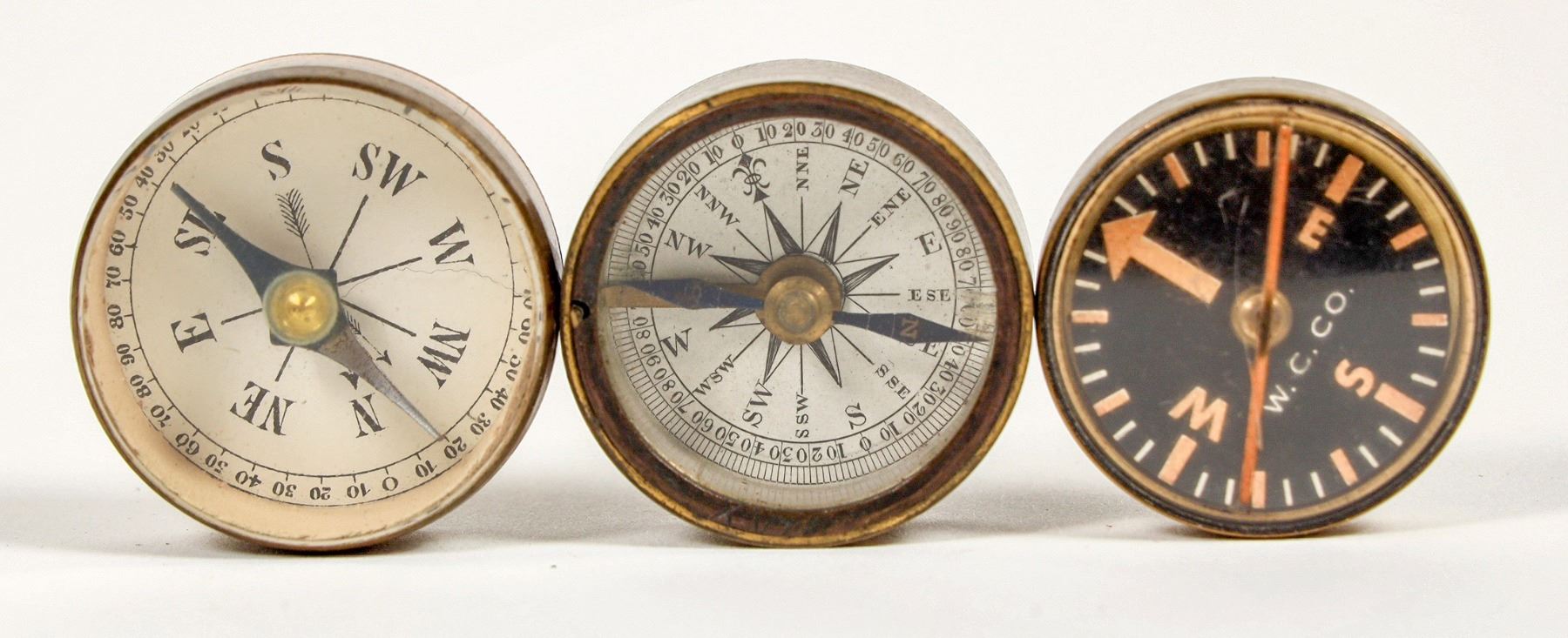 There are three pocket compasses in this group made by Waltham Clock Co., 1900s. All are about 1 in. in diameter. Two pocket compasses have free cover lids. One has a needle stop. The only one marked W.C. & C. has a cracked lens with poor accuracy. Please see photos for details.