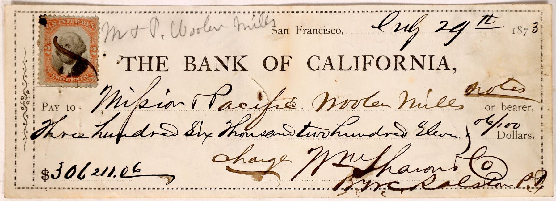Bank of California check signed by W C Ralston, July 29, 1873 made out to Mission & Pacific Woolen MIlls for $306, 211.06, perhaps for the purchase of the entire mill which was sold out of the Ralston estate in 1875, after his suicide, to Levi Strauss along with his partners including Reno tailor Jacob Davis. Above Ralston's signature is written " Charge Wm. Sharon". Sharon was the banks agent on the Comstock and may have loaned Ralston some of the money for the purchase. in 1872, Levis Strauss received a letter from Jacob Davis, one of Strauss' regular customers in which Jacob told Strauss about his copper rivet work pants. Jacob did not have the money for a patent, so he suggested they take out the patent together, which was granted in 1873. Did Sharon communicate his to Ralston prompting him to buy the Mission & Pacific Woolen Mills a couple of months later? This check is signed on both sides, has an orange R15, R2 Internal Revenue 2c adhesive stamp. Very nice condition. San Francisco California Franklin Collection
