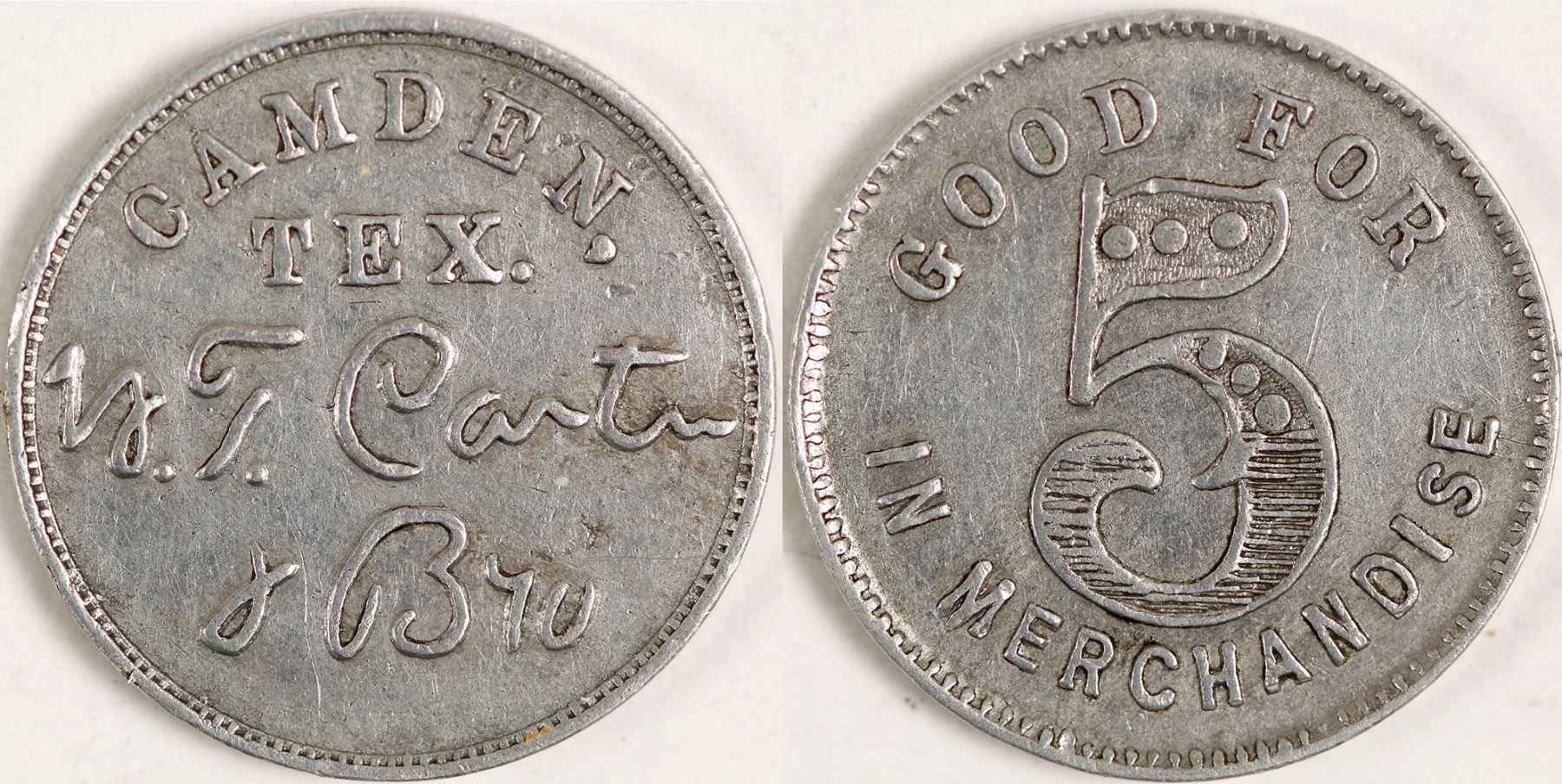 Round aluminum 21mm CAMDEN, TEX. / W. T. CARTER/ & BRO / GF / 5 IM HWAC# 62325 Date: Location: Camden, Texas