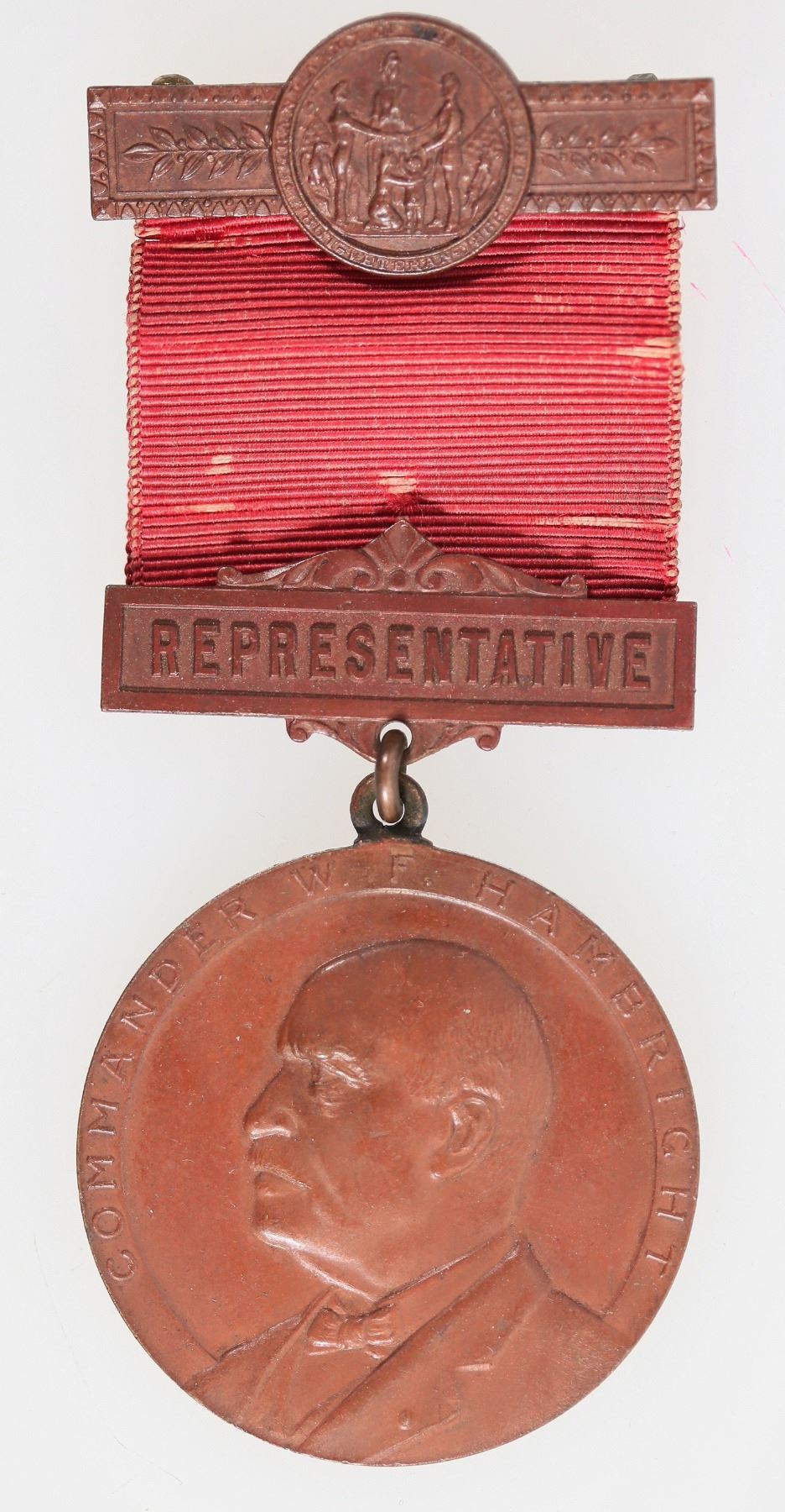 The 57th annual meeting of the Civil War Veterans was held in Greenburg, Pennsylvania, June 1923. This representative's badge features Commander W. F. Hambright. The medal is 38 mm, and the pinback, including the red ribbon is 3 1/2 inches long.