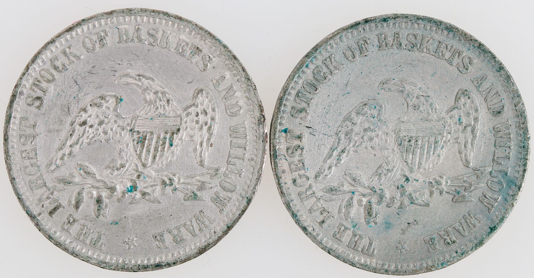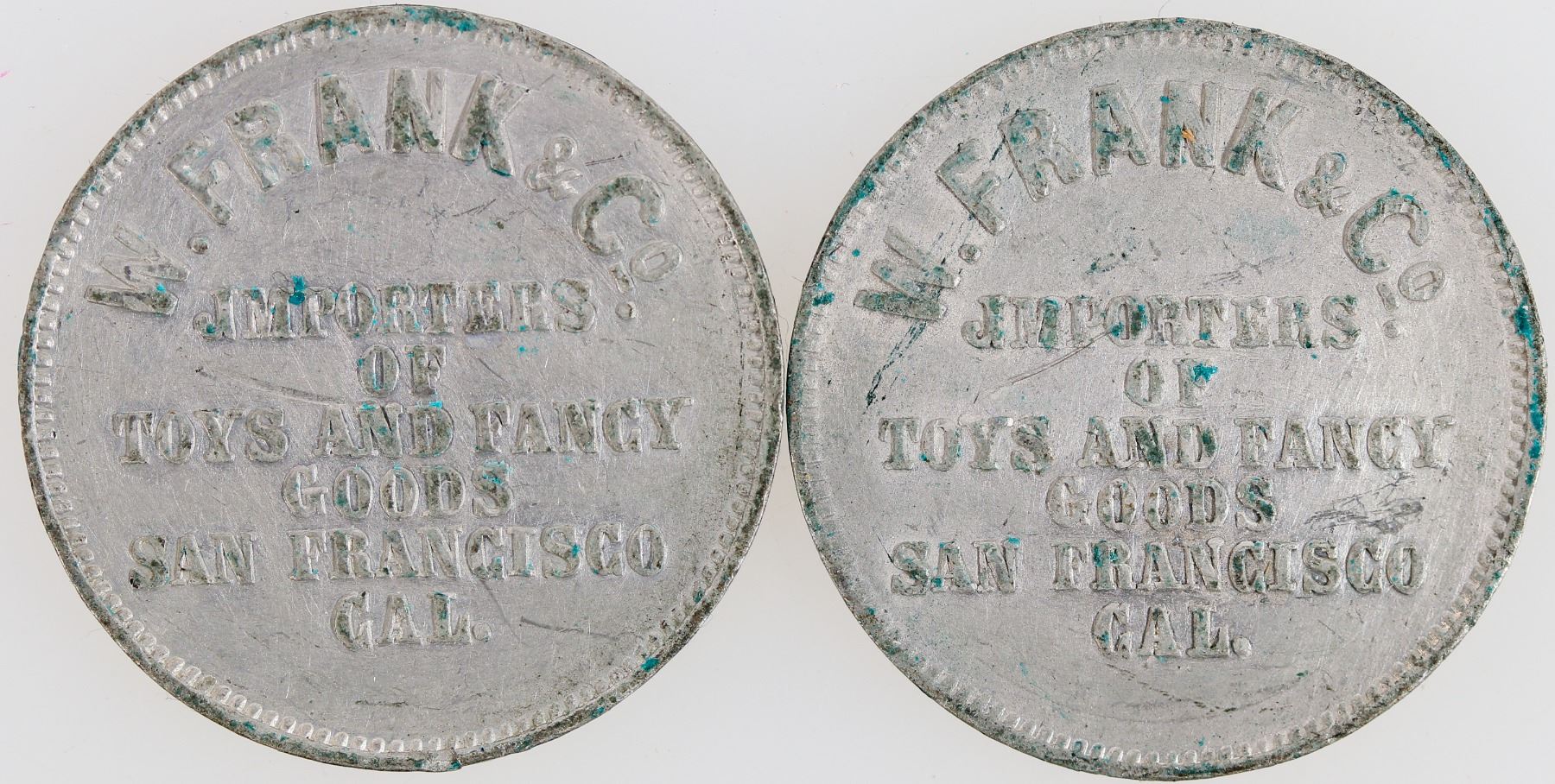 Extremely rare! William Frank & Co. were at 406 and 408 Stockton in 1867. Then at 406 and 408 Battery St. 1868-69, and at 406 Battery St. in 1870. - Rulau. W. FRANK & CO. / IMPORTERS / OF / TOYS AND FANCY / GOODS / SAN FRANCISCO / CAL. // THE LARGEST STOCK OF BASKETS AND WILLOW WARE / (eagle perched on branch); Wm, rd., 27 mm.