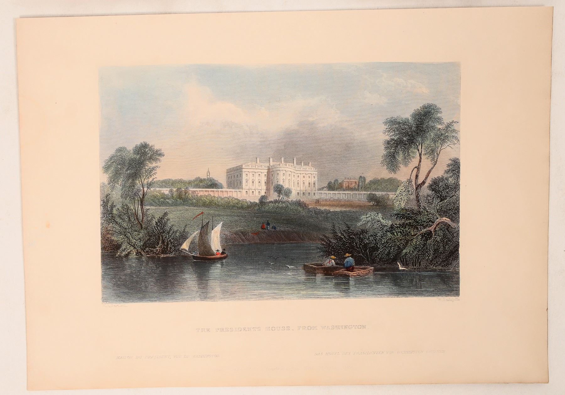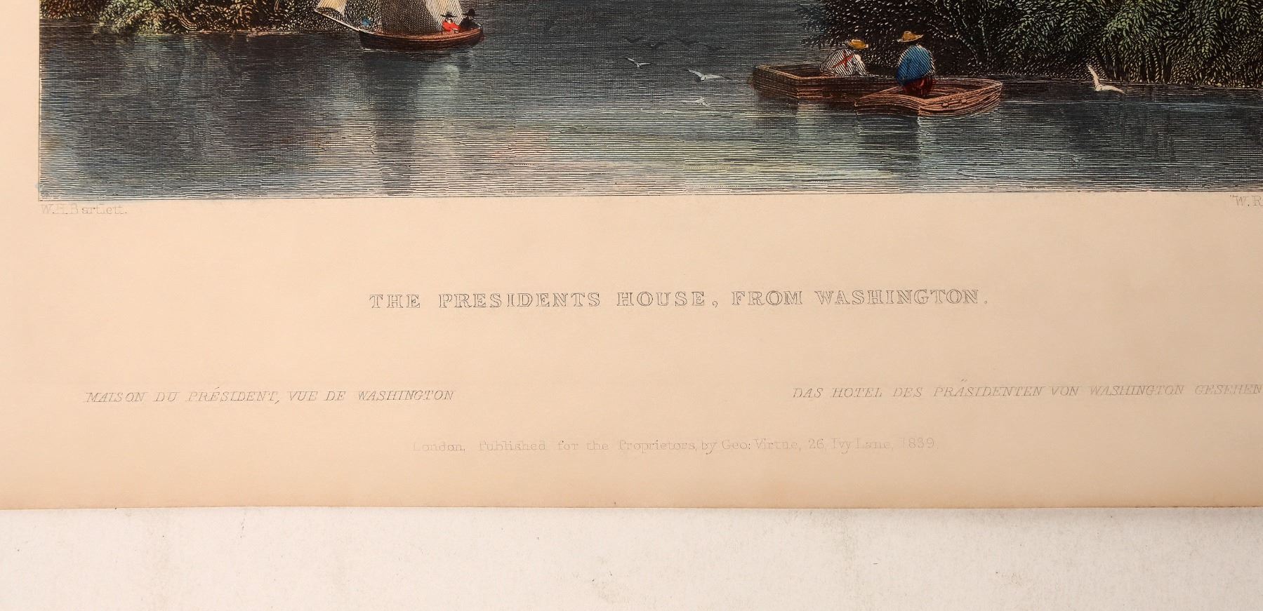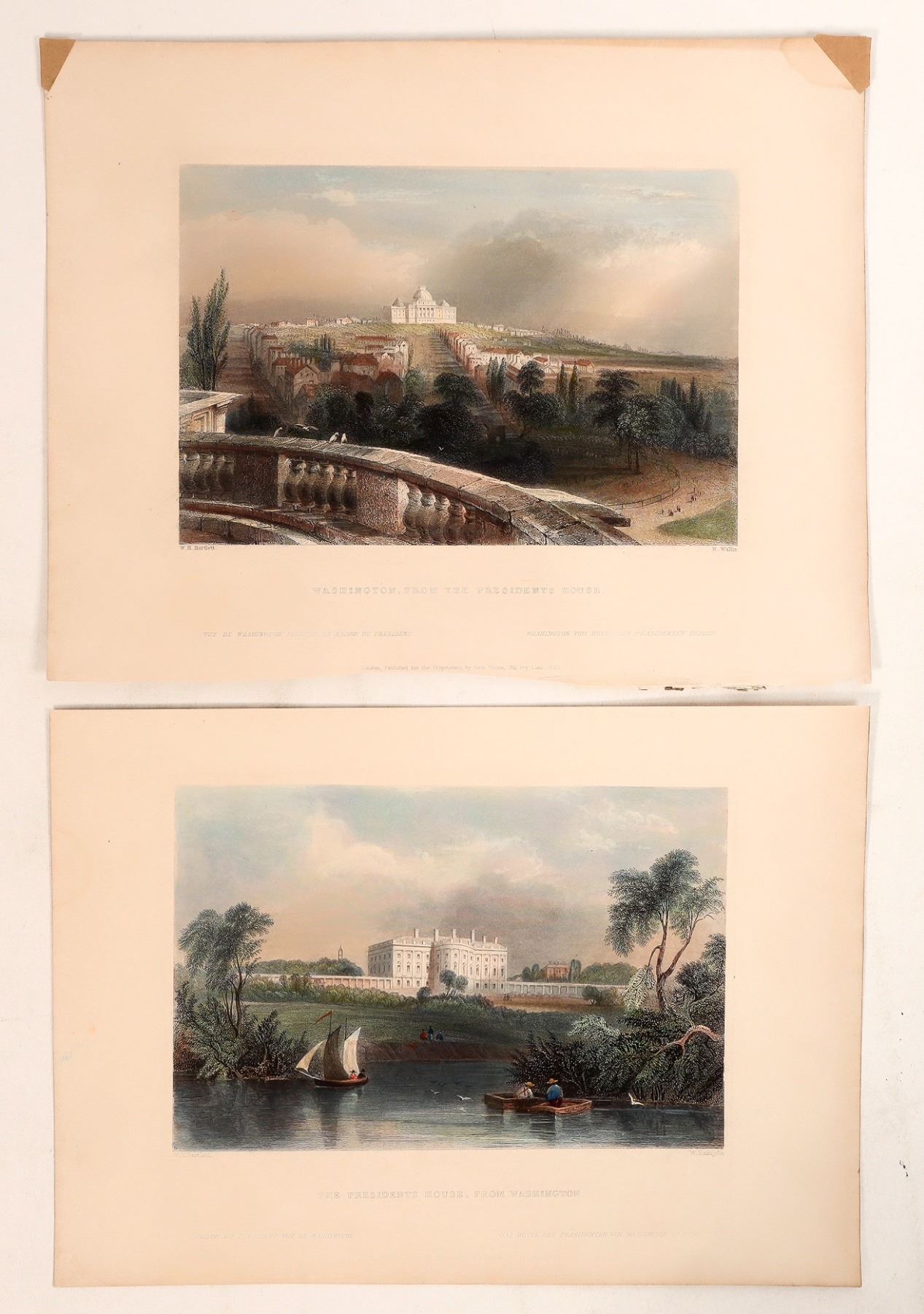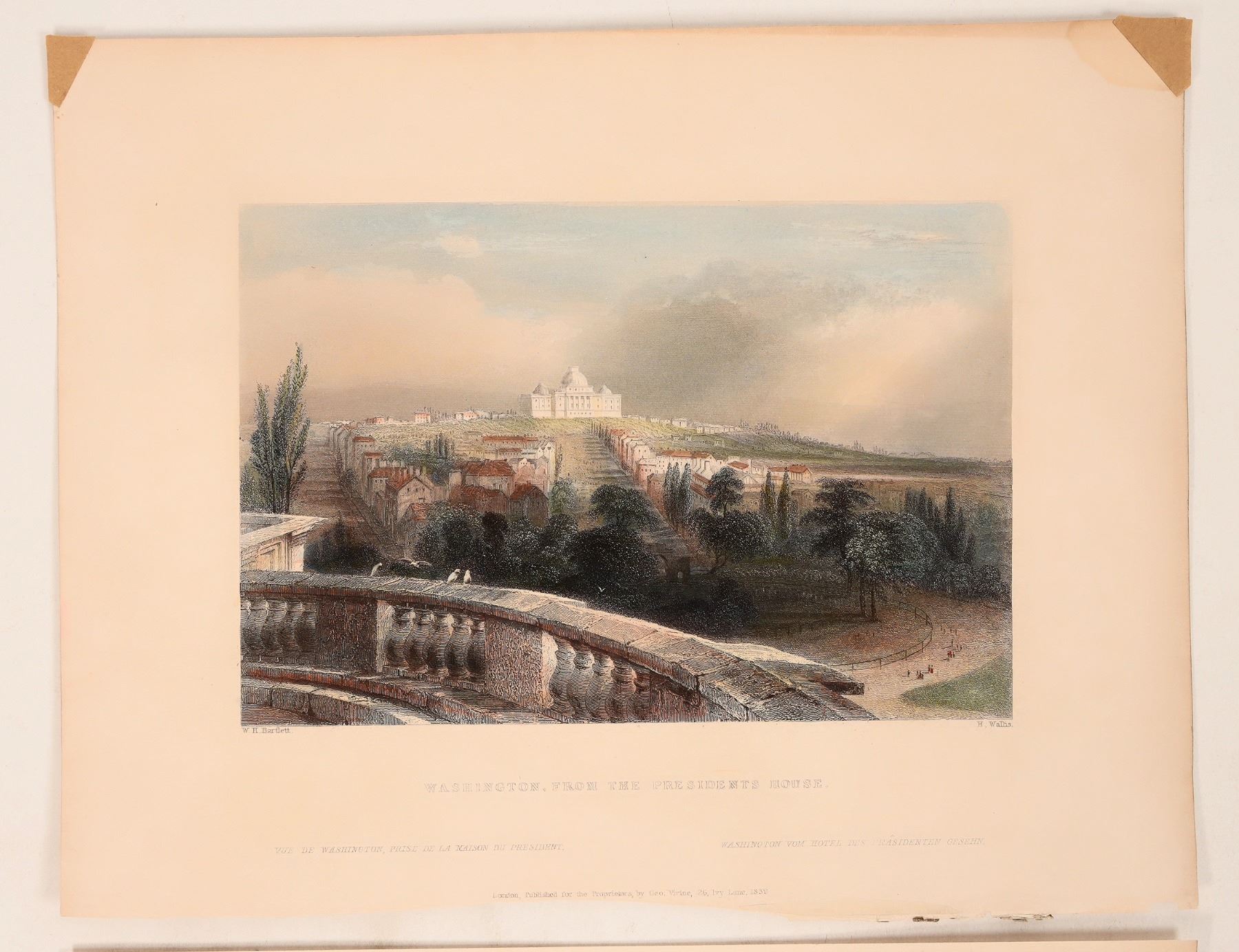 Two 1839 art prints of Washington, D.C. as viewed from the President's house by English artist William Henry Bartlett, a notable illustrator of topography and scenery. Both colored. One print has a water stain in the upper right corner and is trimmed along the bottom margin; the other is torn along the top margin. Both have glued mounting tabs on two corners. Damage is restricted to the page margins and does not impact Bartlett's images themselves. [ Washington, D.C. Washington, D.C.