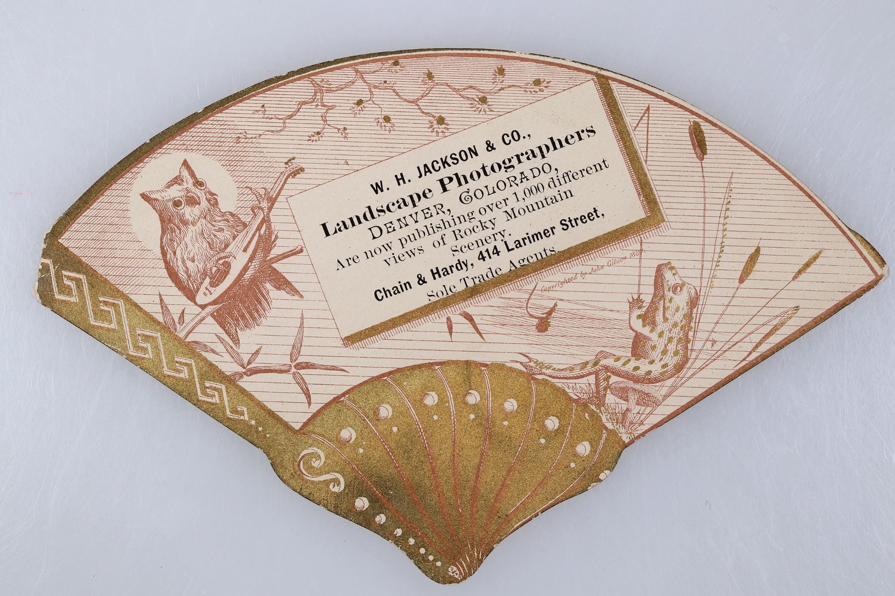 Trade card of W.H. Jackson & Co., Landscape Photographer, Denver, Colorado. W.H. Jackson was one of the famous western photographers in the United States. This trade card is shaped like a fan, approx. 5 x 3 inches. Good condition, in protective sleeve.