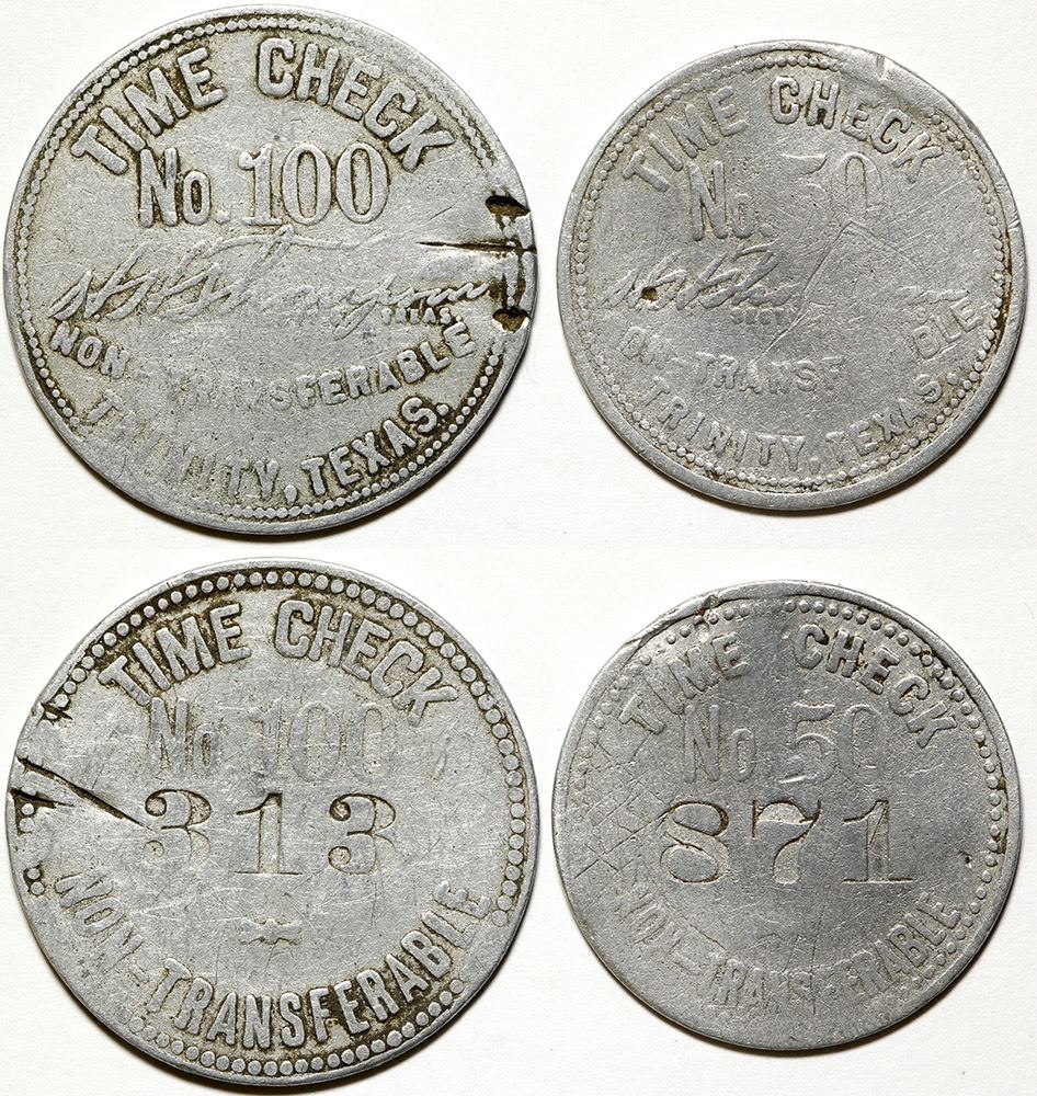 Two time check tokens from RR town founded in 1872 North of Houston HWAC# 62721 Date: Location: Trinity, Texas