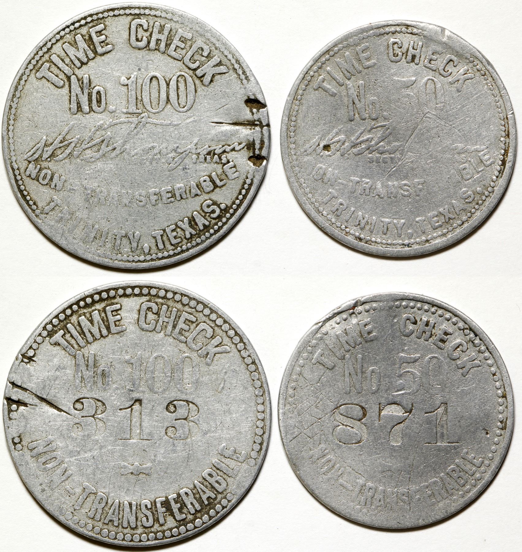 Two time check tokens from RR town founded in 1872 North of Houston State: Texas City: Trinity Date: HWAC# 62721