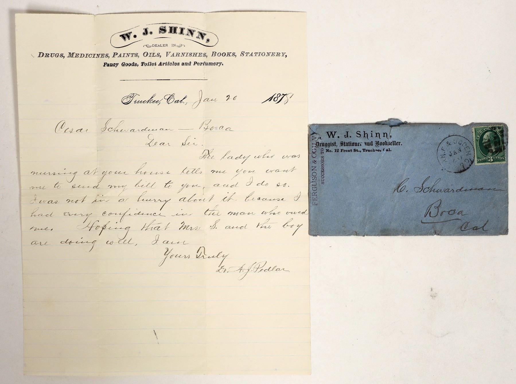 Very rare; we've never offered before! Corner ad cover and letterhead for W.J. Shinn, Dealer in Drugs, Medicines, Paints, Oils, Varnishes, Books, Stationery. Truckee, California, 1878. Message to Cesar Schwardman at nearby ice/lumber camp Boca. Cover is blue with 3 cent postage stamp.