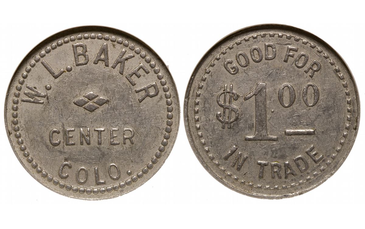 Obv.: W. L. Baker / Center / Colo.; Rev.: Good For $1.00 / In Trade; NGC MS62. Possibly the finest known.