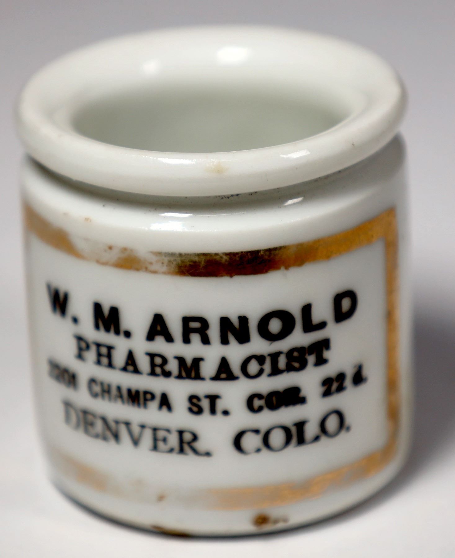 Early druggist jar. W.M. Arnold / Pharmacist / 2201 Champa St. Cor. 22d. / Denver, Colo. Black lettering with gold border on white jar surface. Wear on bottom, some of the gold border rubbed off. 1.5"H.