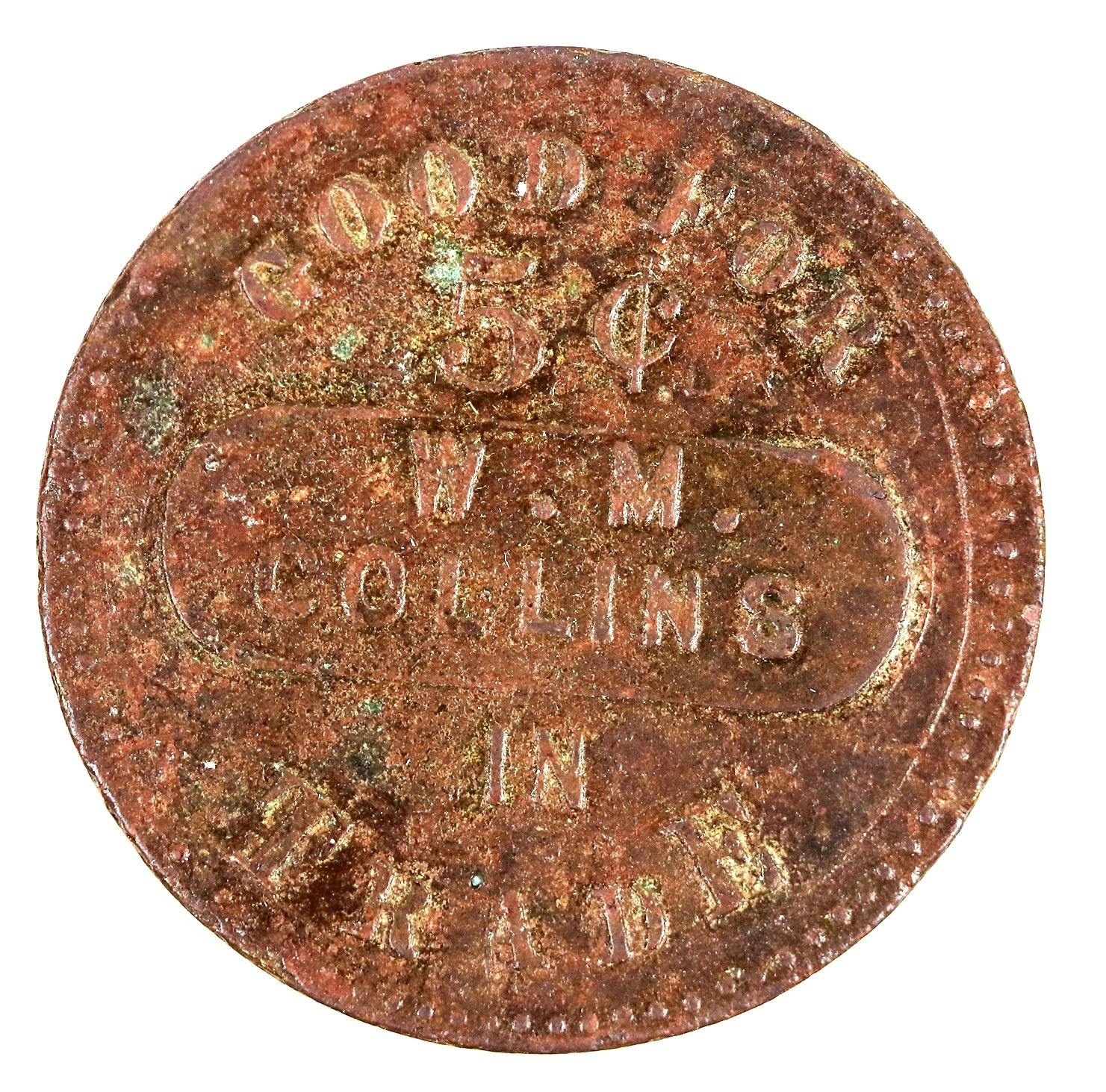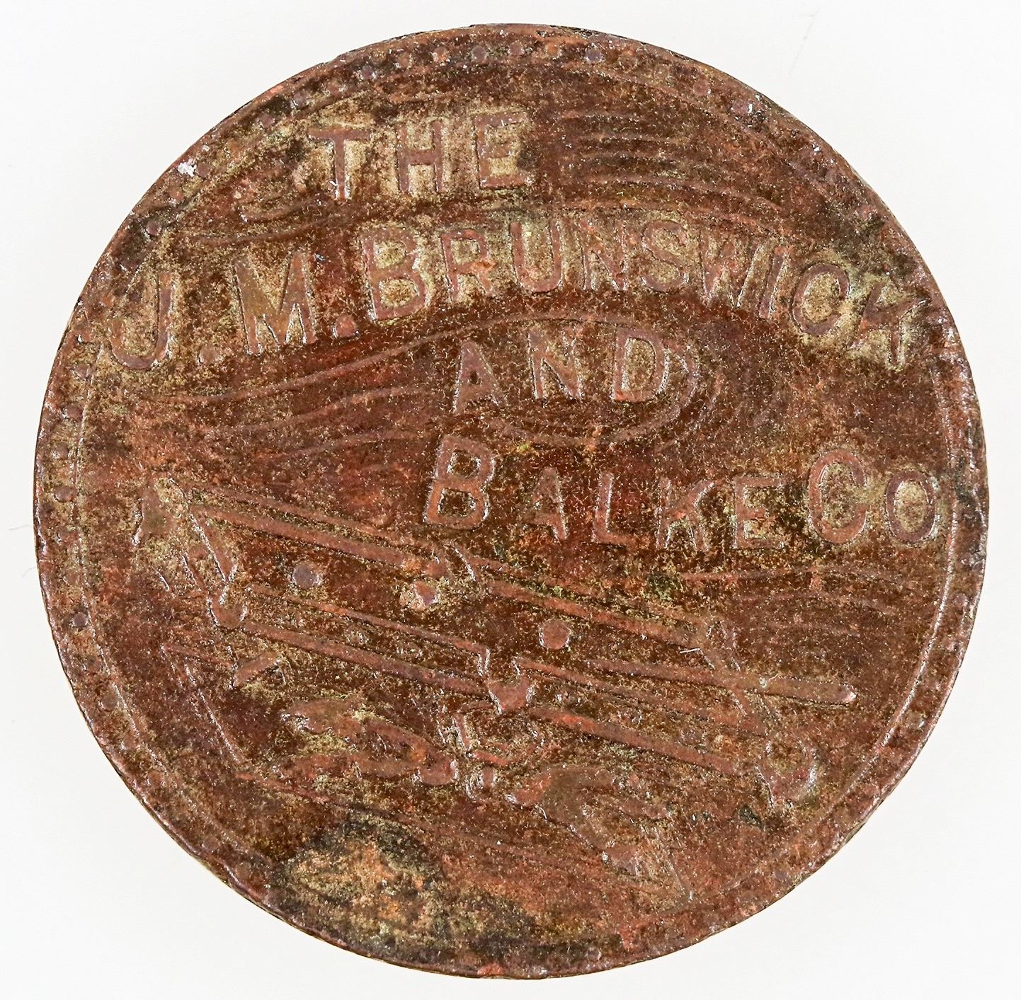 Maverick Brunswick Balke pictorial pool table token. GOOD FOR / 5c / W.M. COLLINS. / IN / TRADE // THE J.M. BRUNSWICK & BALKE COS / CHECK ; Br., rd., 24 mm. Tokencatalog.com notes: "Wm. M. Collins, saloon, at 84 Washington, Chicago, IL. as listed in 1880 IL. Gaz. & 1883 Chicago City Dir. Contributed by: wlrotz"
