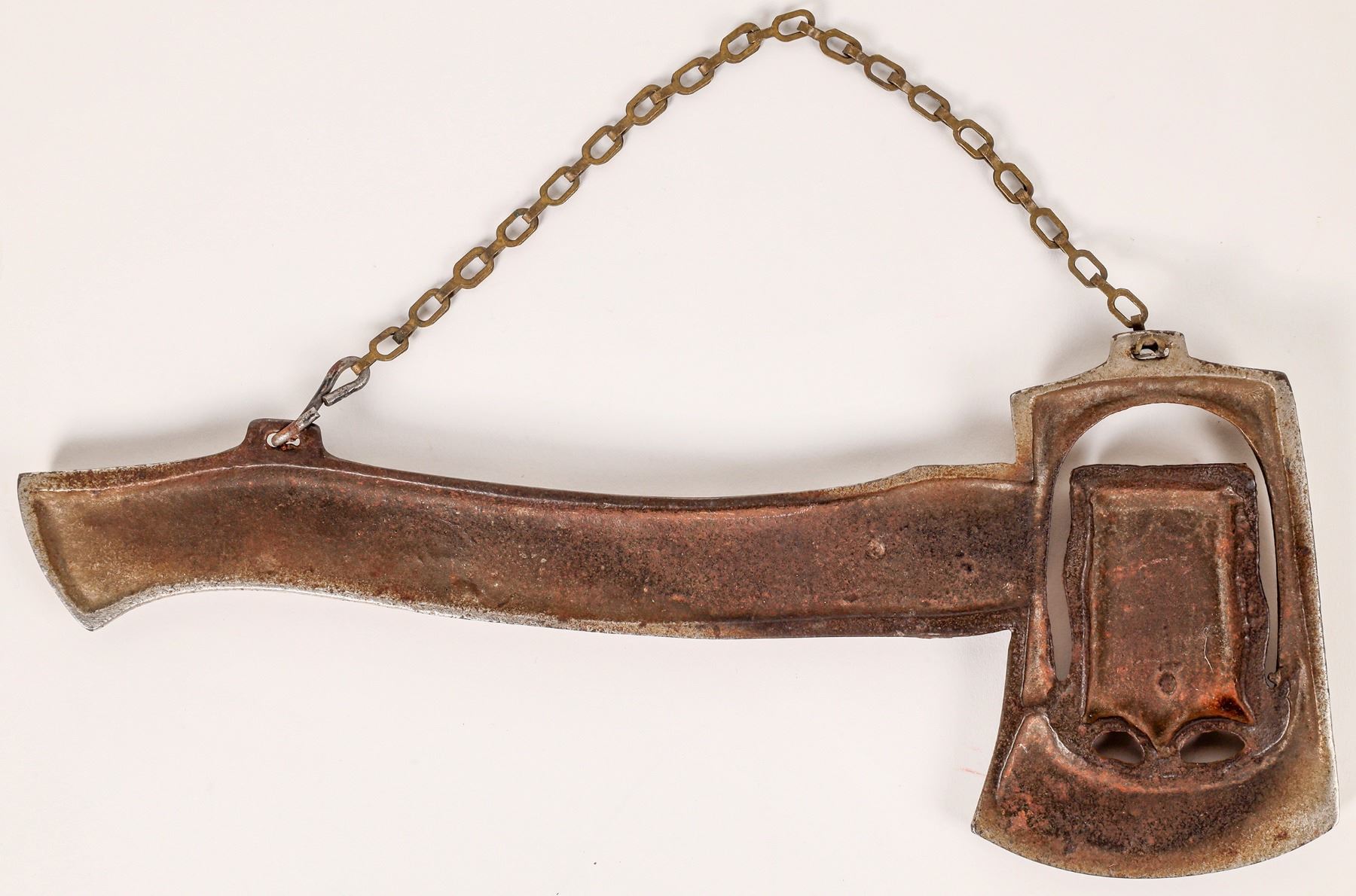 This cast metal hatchet is marked "W.O.W." for Woodmen of the World. First as a fraternal organization for charity established in 1890; now an insurance company based in Omaha, Nebraska. The logo is a tree stump with two hatchets and a wedge. 11.5 in. X 5. in. In good condition with some light oxidation and a box chain.