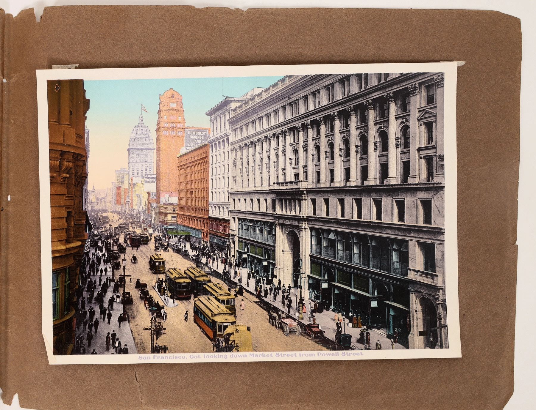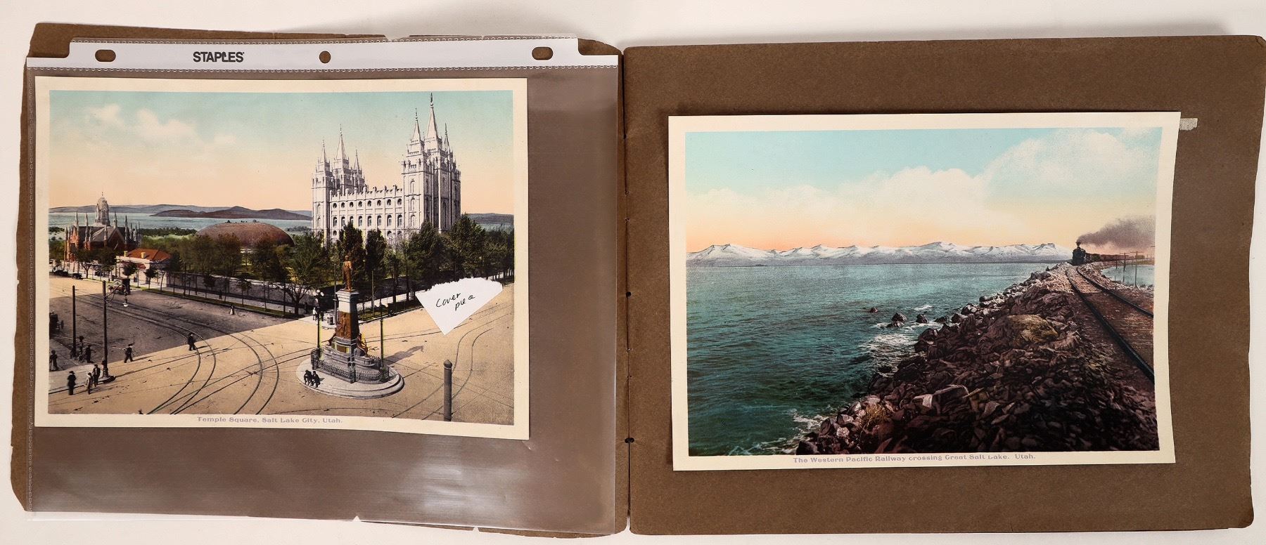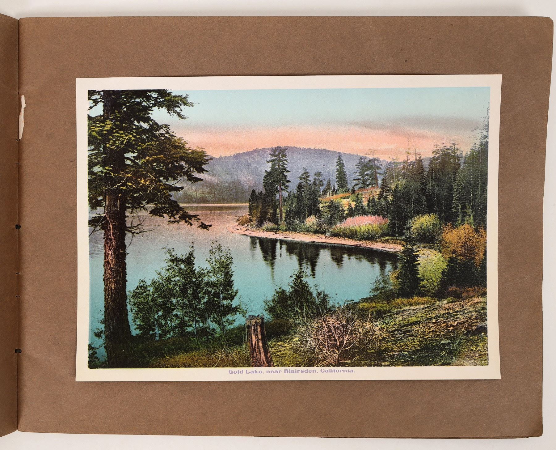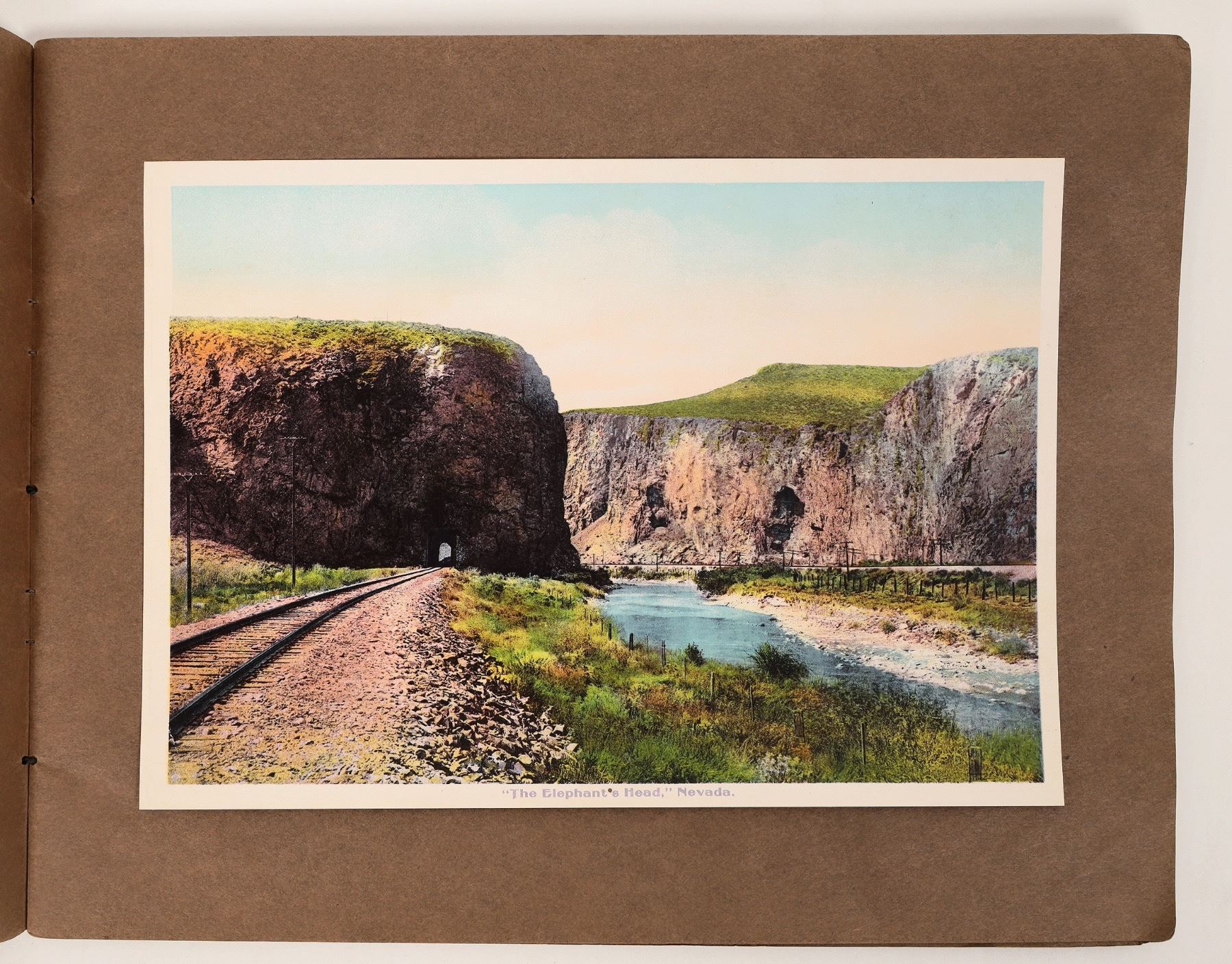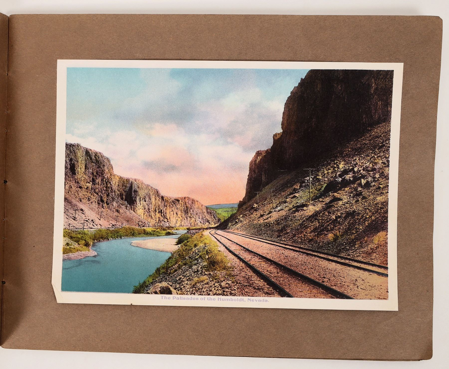 Lot of 24 vintage color pictures of the Western Pacific Railroad Crossing from Utah to California. The images are mounted on heavy brown paper and bound together into a rudimentary book. While the book contains a few images from Utah and Nevada, the vast majority are taken in Plumas County, California, featuring numerous views from the Feather River Canyon. Also included is an image of San Francisco's historic Market Street.