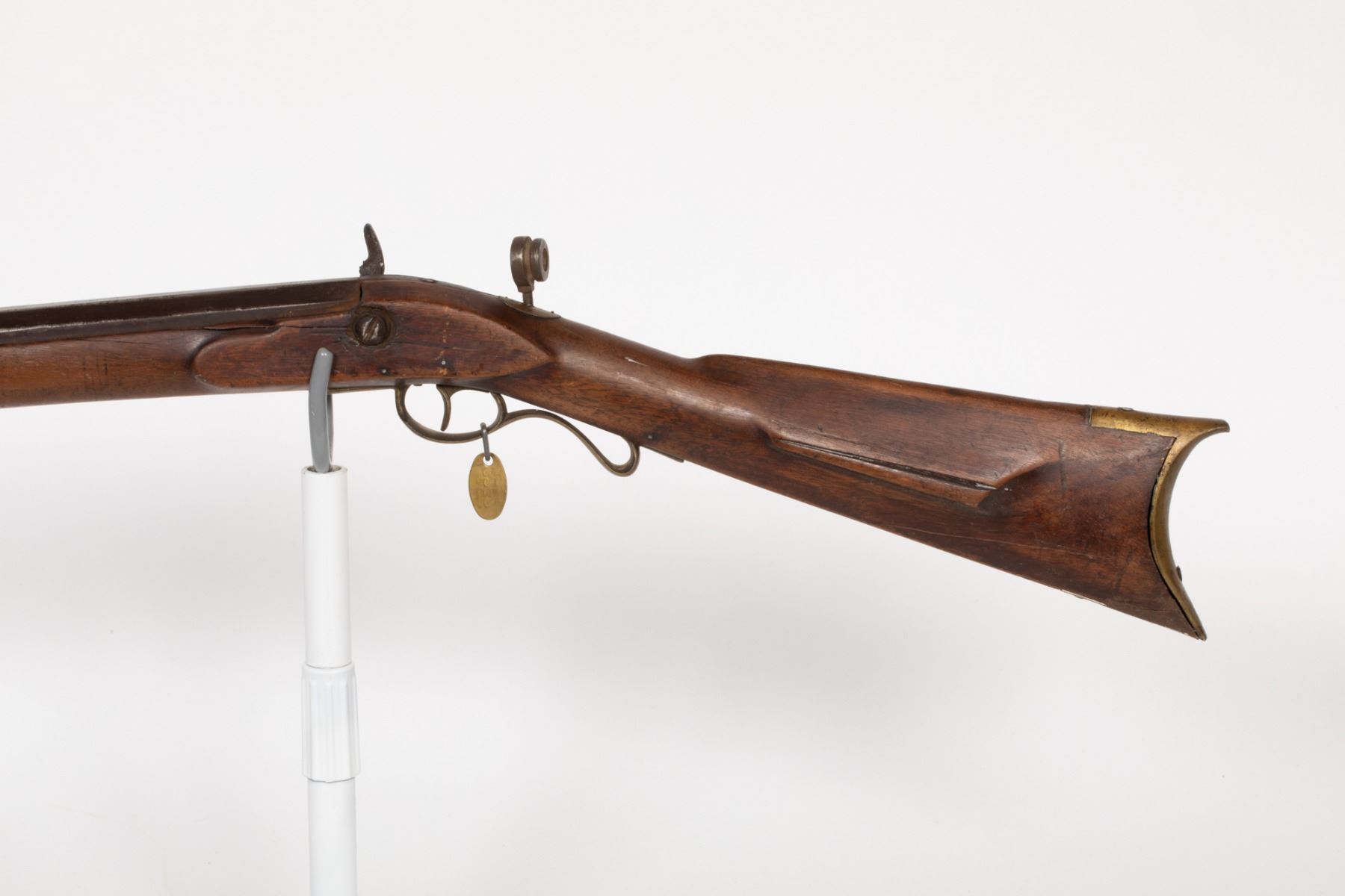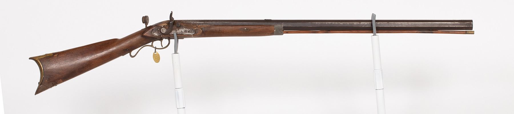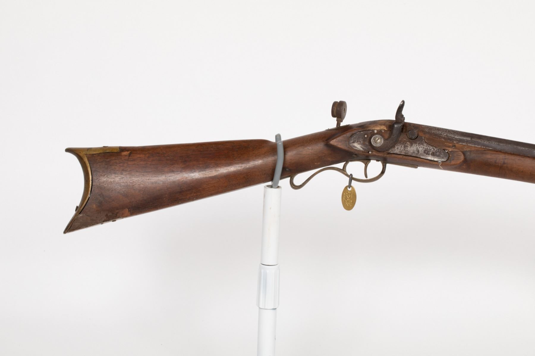 This is a half-stock Kentucky rifle in percussion. Overall condition is fair. SN: N/A, JMD Oval Tag: 6252, Condition: Fair, >