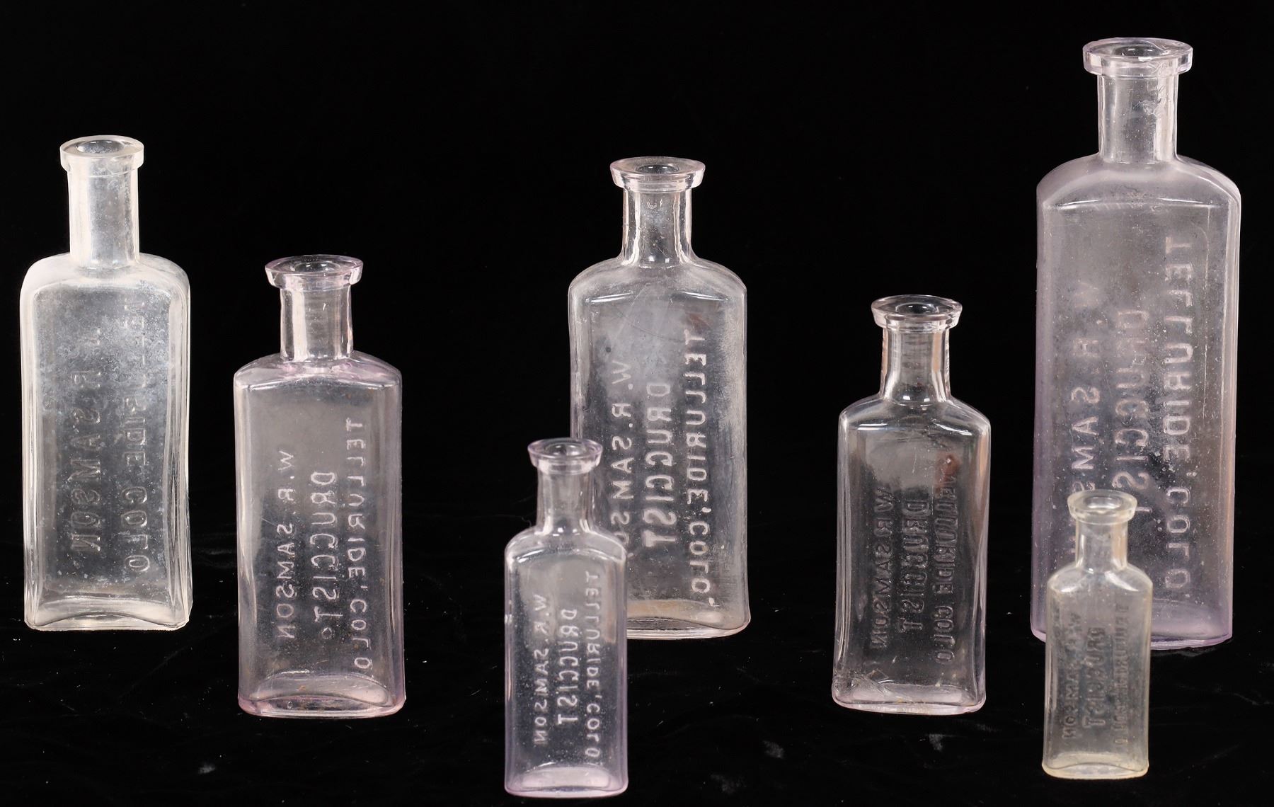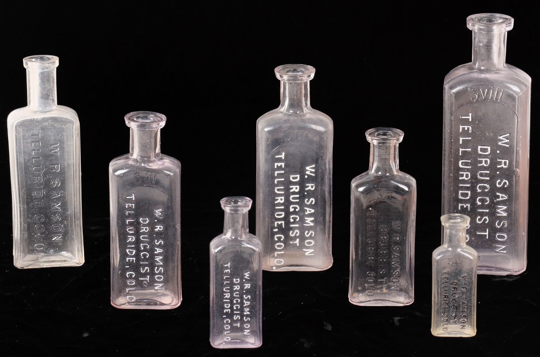 7 different embossed and black or white embossed W R Samson Druggist bottles. 3", 3.5", 4.5"-base crack, 5"-lip bruise, 5.25", 5.5"-base ding, 6.75".