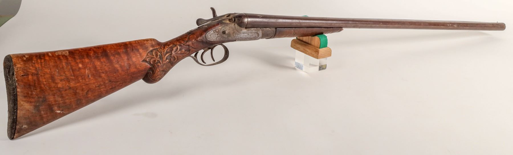 This W. Richards side by side hammer shotgun is 12 gauge with Belgian black powder proof marks. C. 1870-1880's. S/N 627 on the water-table. The lock-plate is relief carved and marked Belgium. The buttstock is relief carved in a leaf pattern and very well done. The forearm has a similar fleur de lese pattern. The barrels are fluid steel at 30.375 in. choked Mod./Mod. The barrel bores are without pitting. The right lock is missing the hammer and the forearm is intact however split on one side. The action has minor slop when closed. 47 in. overall length and the buttplate is original but in poor condition. This gun is an antique and no attempt has been made to fire this gun to confirm its mechanical integrity. Nor should this gun be fired without the examination by a qualified gunsmith. Any attempt to fire an antique is at the risk of the owner and not consistent with the value of the firearm. No sales to New York, New Jersey, California, and Hawaii. No FFL required. Please see photos for details.