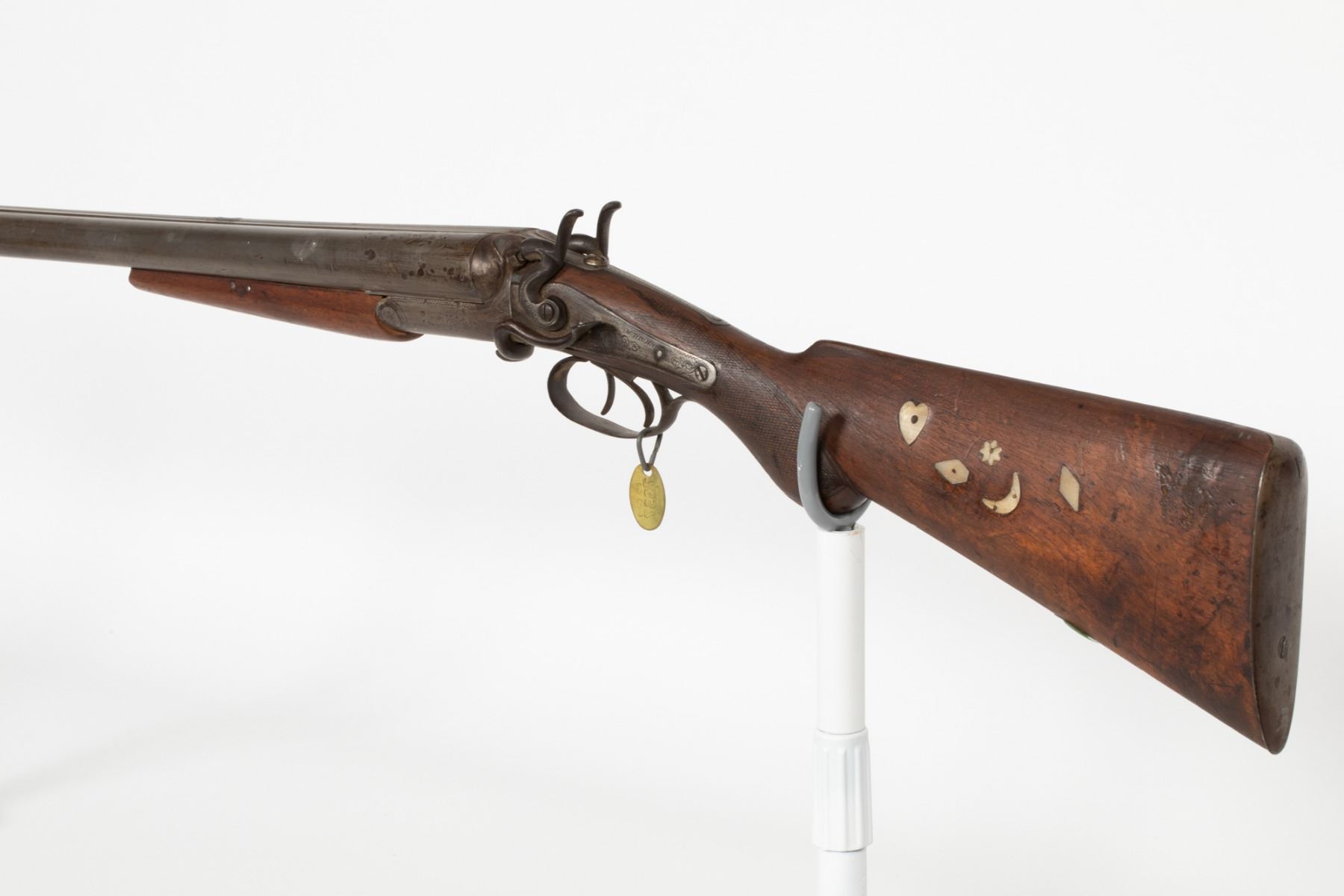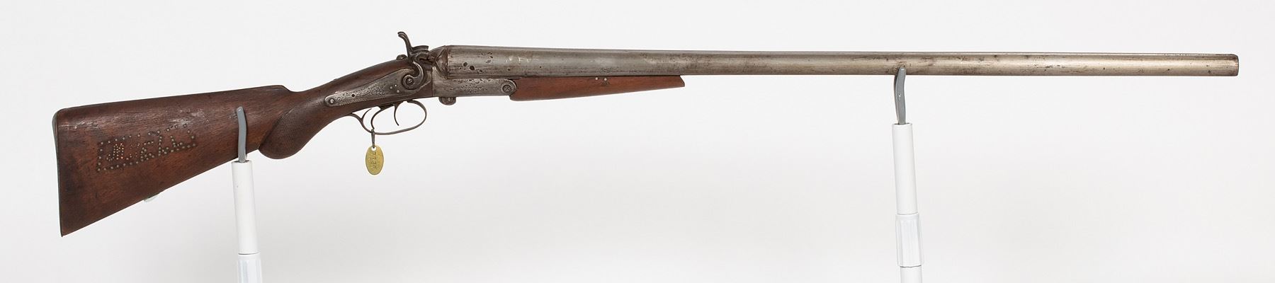 This is s Wesley Richards 10 ga. SxS shotgun. It uses back-action locks and has a side lifter release. It is in fair condition. SN: 1172, JMD Oval Tag: 7357, Condition: Fair, >