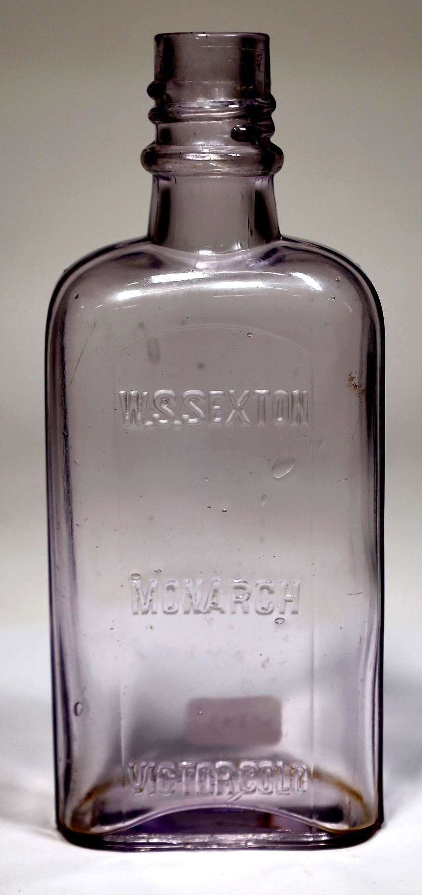 Preble W-143. W.S. Sexton / Monarch / Victor, Colo. Purple glass, smooth top, 6.5" Some bubbles, small adhesive label on reverse, imperfection on front of base. Please inspect. The Monarch Saloon was located on N. 3rd Street and catered to high-class clientele with private clubrooms and a large gambling hall on the second floor.
