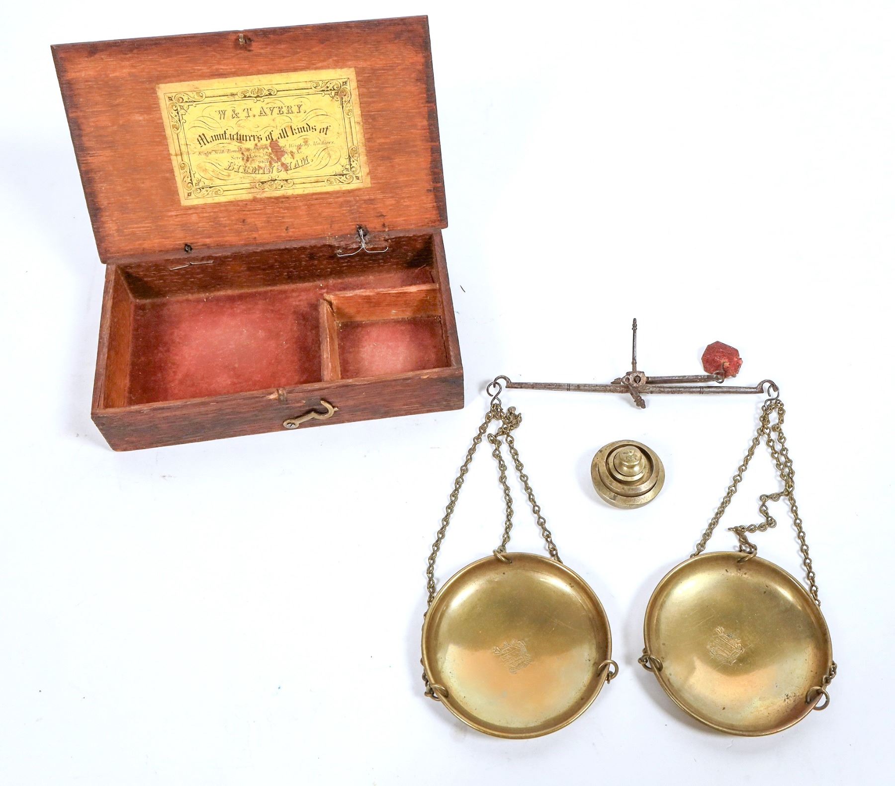 W & T Avery scale set with original paper label inside lid. 4 nested brass weights. Wood case is 1.5x7x4". Right hinge hole in case is partially missing. Please inspect.