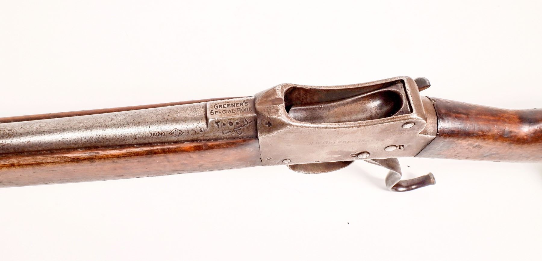 This W.W. Greener shotgun is 42 in. overall length with a 25.25 in./ 64 mm barrel, the bore has no pitting. It is full stocked with a single barrel band, it is marked EG in the receiver and on the buttstock. S/N 12914. The barrel is not proof marked for smokeless powder, therefore it is a black powder shotgun. C. 1870-1880s. The breach is marked "Greener's Special Bore" with a British crown proof mark and the number "13". The receiver is marked "W.W. Greener. Maker" on the left side. On a Martini action; falling block. A standard 12ga. hull will not fit the chamber and the Greener riot control police guns were known to take a unique 12/14 ga. hull; this is one of those guns. It also has Arabic notations on both sides of the breach indicating that this shotgun may have served duty in one of the Crown's territories. The metalwork has a gray patination, and handling marks on the stock consistent with proper handling and care for one hundred plus years. This gun is an antique and no attempt has been made to fire this gun to confirm its mechanical integrity. Nor should this gun be fired without the examination by a qualified gunsmith. Any attempt to fire an antique is at the risk of the owner and not consistent with the value of the firearm. No sales to New York, New Jersey, California, and Hawaii. No FFL required. Please see photos for details.