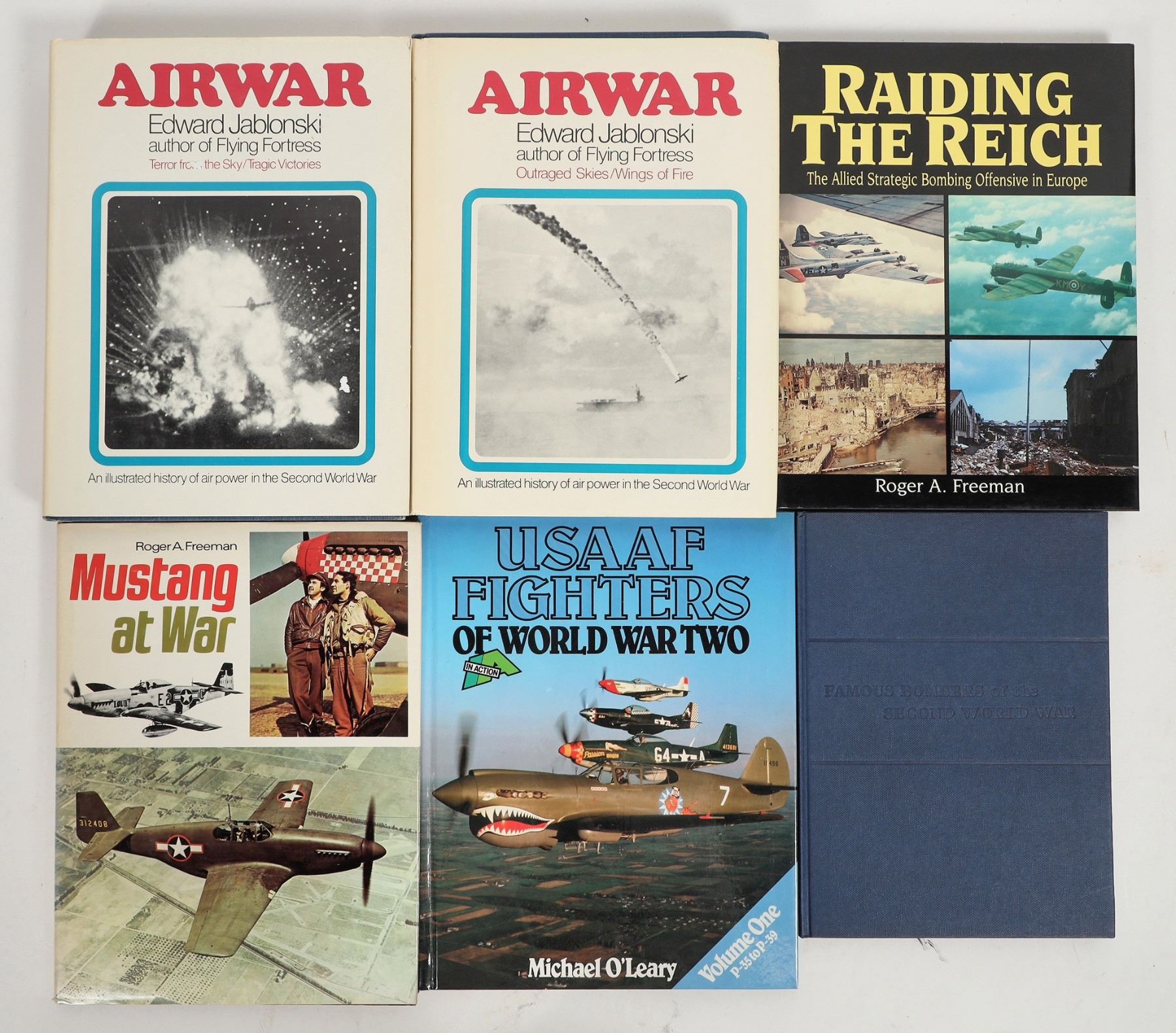 Lot of 6. 1)"Bombers of the Second World War", by Wm. Green, published by Doubleday & Co., 1959 ~ (7 1/2"x 10", HB, 134 pages) 2)"Raiding the Reich", the Allied Strategic Bombing Offensive in Europe, by Roger A. Freeman, published by Arms & Amour, 1997 (8 1/2"x 11", HB, 160 pages) 3) "Mustang at War", by Roger A. Freeman, published by Doubleday, 1974 ~ (8 1/2"x 11", HB, 160 pages) 4) "Air War ", an illustrated history of air power in WW2 , 2 Volumes, By Edward Jablonski, publ. by Doubleday & Co., N.Y., 1971 ~ 8 1/2 x 11", HB, 470 pages total) 5) USAAF Fighters of WW2, in Action, Vol. 1, P-35 to P-39, by Michael OíLeary, Published by Historical Times, Harrisburg, PA1986 ~ (8 1/2"x 11"HB, 160 pages)