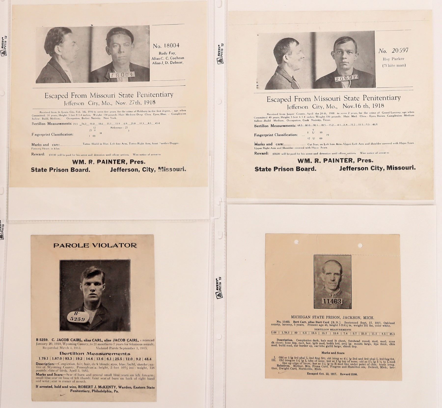 This collection of escapee wanted posters are from the 19-teens; four bad-guys in all. It appears that finger-printing became standard operation by 1918. The Bertillon measurements were used earlier and the most informative would be the tattoo and scar identifications. Find out which relative was the barroom scrapper. Names are: Fay, Carr, Cairl, and Parker. All are original prints from around the country. Apparently, "Most Wanted" was hard work.