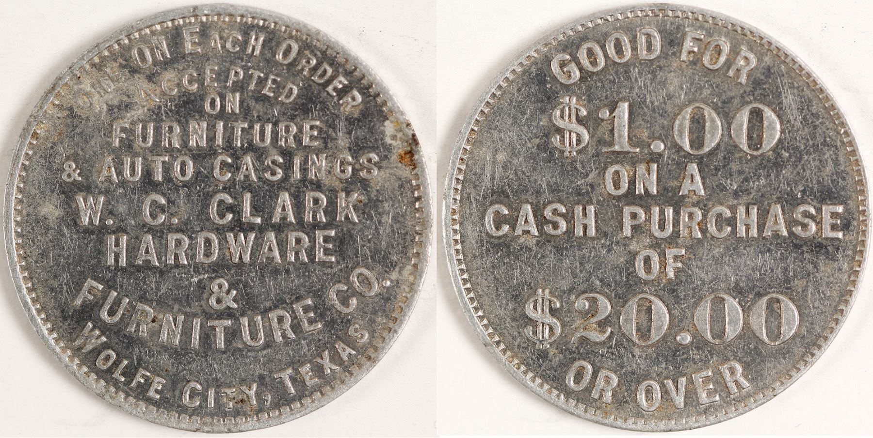 Round aluminum 40mm ONE ON EACH ORDER ACCEPTED ON FURNITURE & AUTO CASINGS / W. C. CLARK HARDWARE & FURNITURE CO. / WOLFE CITY, TEXAS // GF $1.00 / ON A CASH PURCHASE OF $20.00 OR OVER. Rare. HWAC# 62374 Date: Location: Wolfe City, Texas