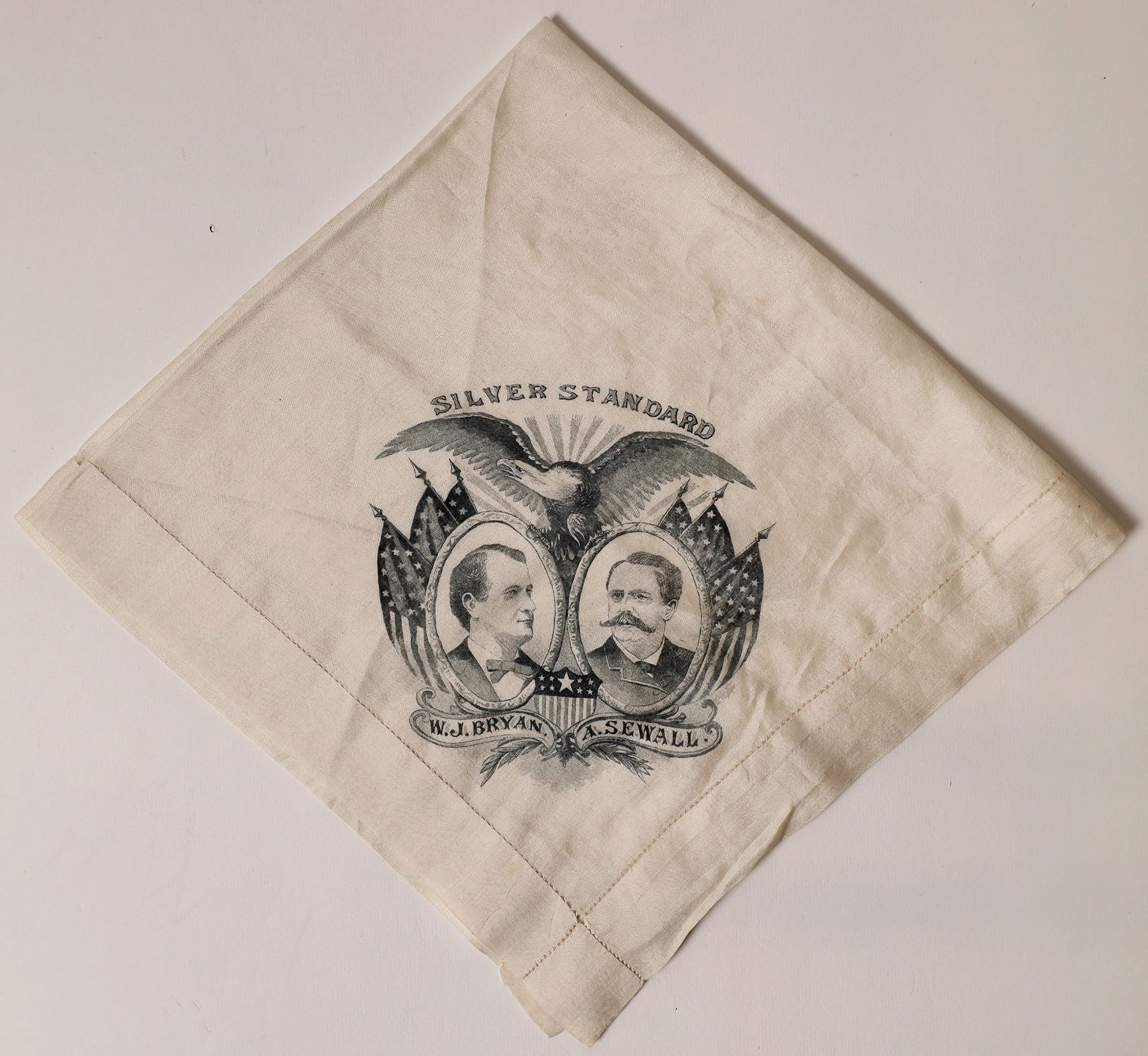White linen jugate handkerchief of WJ Bryant and A Sewall." In 1896, William Jennings Bryan ran unsuccessfully for president of the United States. Bryan, a former Democratic congressman from Nebraska, gained his party's presidential nomination in July of that year after electrifying the Democratic National Convention with his Cross of Gold speech. He was defeated in the general election by the Republican candidate, former Ohio governor William McKinley." from Wikipedia. 17x17". 1 small hole.