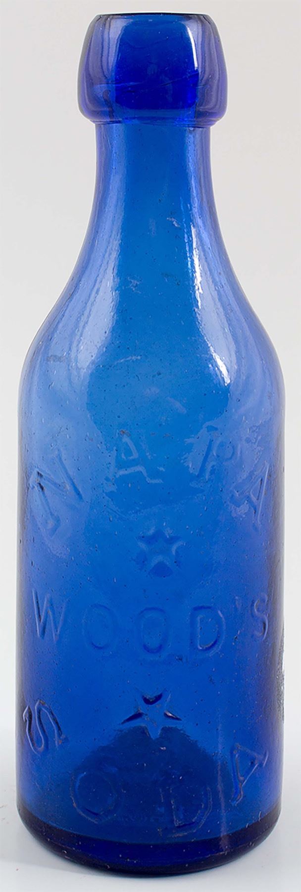 Napa ( au ) / Motif : Star / Wood's / Motif : Star / Soda ( ad // Reverse embossed : Natural ( su ) / Mineral Water ( su ) / )T. W. F. ( Which stands for : Thomas W. Fenn ! ) - A.G.T. ( Which stands for agent ! ) // Lighter bodied, Royal Cobalt blue, blob top soda bottle. . 7 1/2" tall, applied top. Really good quality glass, with tiny pin point bubbles, scattered through out the body of the bottle. Minute base edge bruising, 1/4" in size, on the front edge. Can not bee seen when displayed. Outstanding colored bottle. #2 of 3, being offered in this sale. ( RH ). State: California City: San Francisco Date: 1870-1872 HWAC# 30212