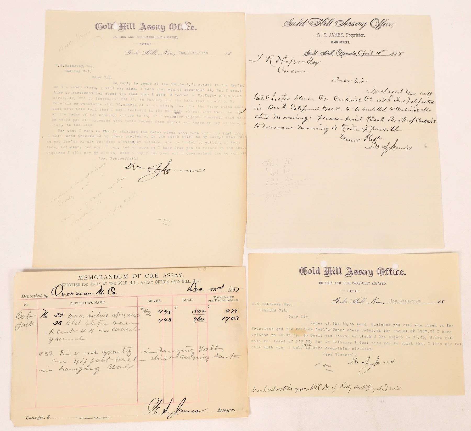 Lot of 4. The Gold Hill Assay office was founded by Conrad Wiegand, passed onto Samuel Dowling, then back to Wiegand's son, and then sold to W.S. James. 1) Memorandum of Ore Assay. Deposit by the Overman Mining Company. Dec. 1885. Two assays with pencil notes about the locations (hanging wall). Signed by James. 5.5 x 8.5" Folds, toning. 2) 1888 letterhead addressed to TR Hofer in Carson. Message about checks for the Centennial Company. Signed by James. 3-4) Two typed lettersheets, 1900, both to WS Hathaway in Banning, California. Message regarding water stocks.
