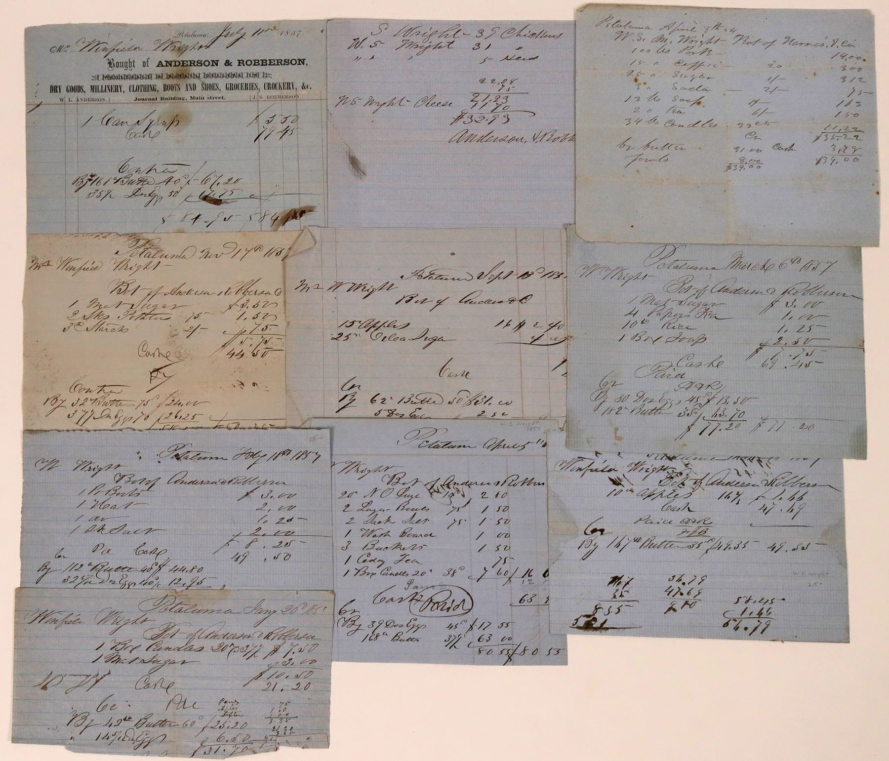 Lot of 10 documents. These are handwritten receipts and one billhead, all from Petaluma in 1857. FH believes this WS Wright to be the same that made his way to the Comstock. William S. Wright started the first soda works in Nevada. He is also the first verifiable Nevada merchant to place a product in personalized embossed bottles. He came to Virginia City in 1861. In July 1863, Wright placed an order for 24,000 soda bottles with the new western glass manufacturing plant in San Francisco, Pacific Glass Works. The order was so important that the news was published in both Sacramento and San Francisco newspapers. Wright operated his soda business at the north end of Virginia City. He closed or sold this business in 1867, perhaps selling to George Morrill. After unsuccessfully trying to run a stage line to Meadow Lake, Wright returned to Virginia City and opened a cigar business.