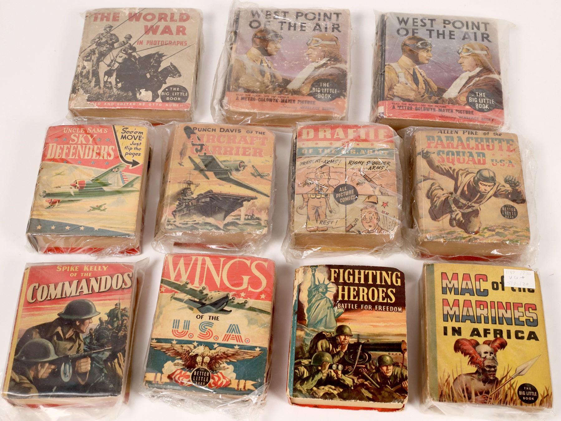 10 WW 2 Big Little Books. Spike Kelly of the Commandos, Punch Davis of the Aircraft Carrier, Mac of the Marines in Africa, Draftie of the US Army, Allen Pike of the Parachute Squad USA, Uncle Sam's Sky Defenders, Wings of the USA, The World War in Photographs, West Point of the Air x2. Condition fair to very good.