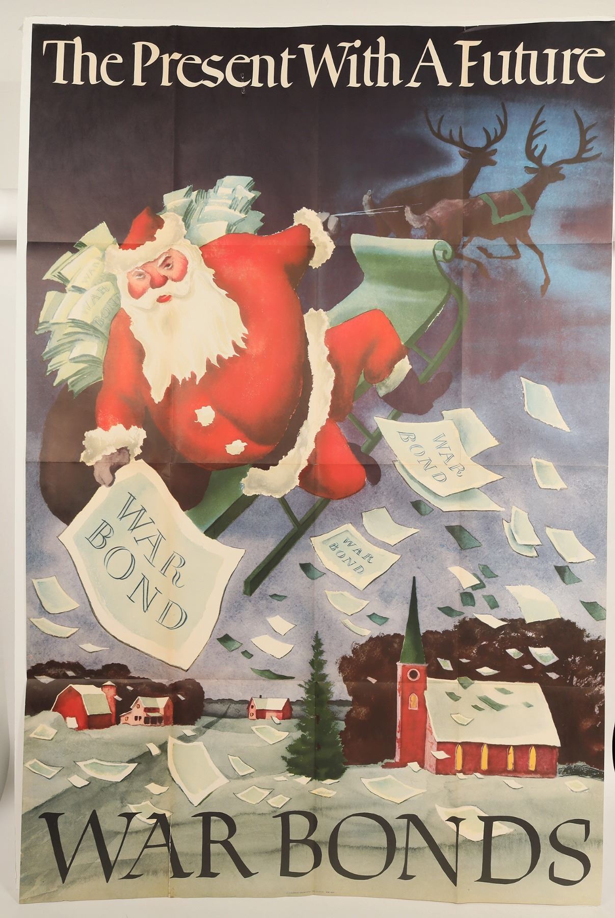 c. 1942 US Government Printing Office WW 2 Christmas War Bond poster featuring Santa with his sleigh and reindeer. 60x40" in nice condition!