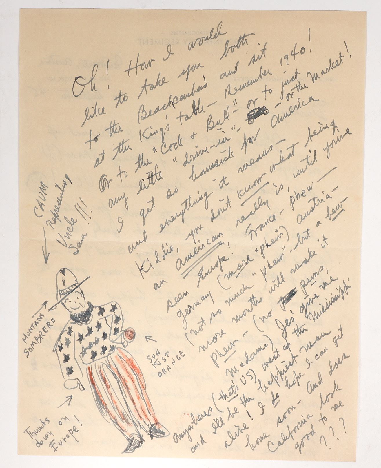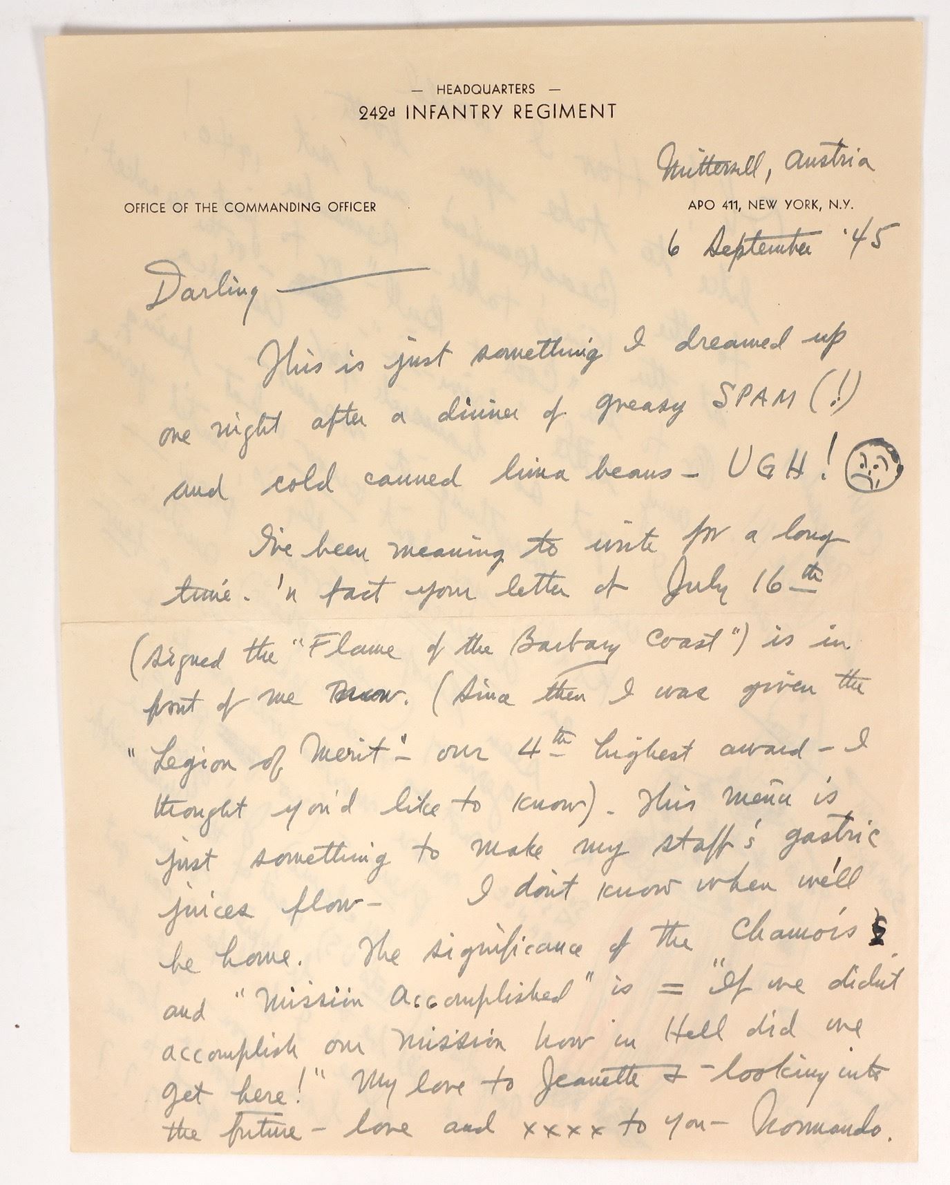 1945 letter on 242nd Infantry Regiment letterhead of Office of the Commanding Officer, who was Colonel Norman C. Caum. This letter is illegibly signed, perhaps it is from Caum? This regiment fought the Germans and was later assigned to the occupation of Austria. Details of bad Spam and cold lima beans, being awarded the Legion of Merit, a disdain for Europe and being homesick for California etc. Verso caricature of Caum as Uncle Sam in red and blue with Montana sombrero, with a Sun Kist orange and thumbs down on Europe.