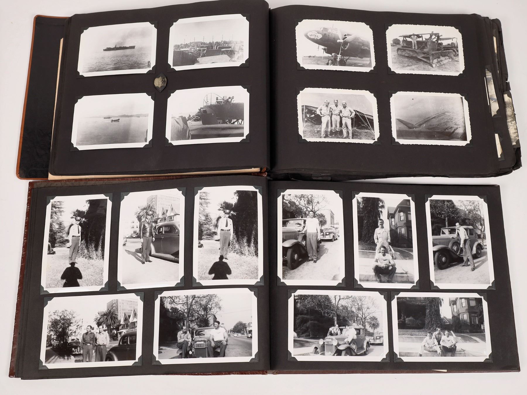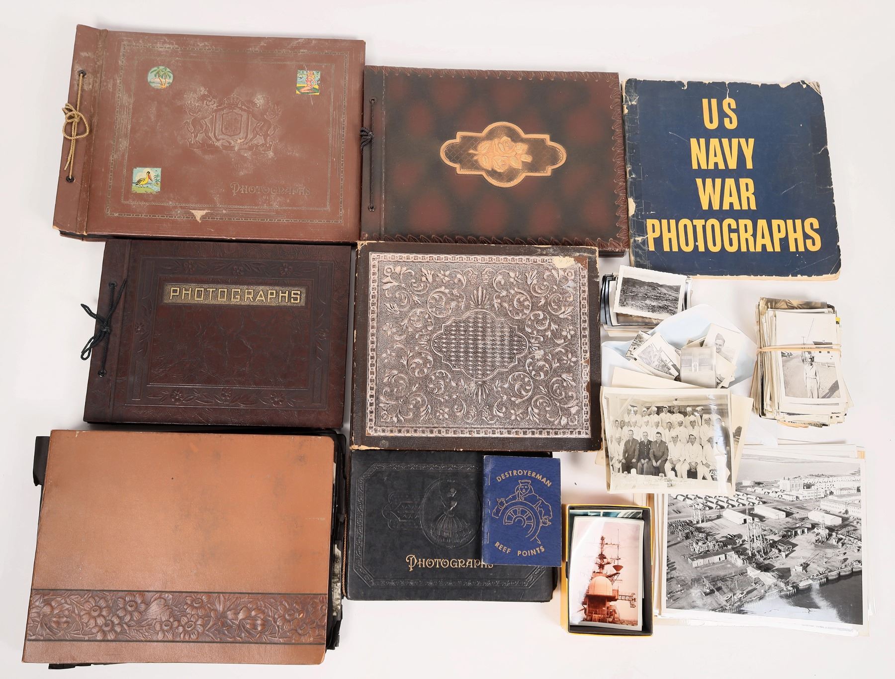 About 750 mostly original WW 2 b/w photos. Some 8x10', mostly smaller. Some loose, some in albums. Ships, mess, Naval shipyard San Francisco, bombed Japan, bulldozers, US bombers, postcards, family albums, and other military ephemera.