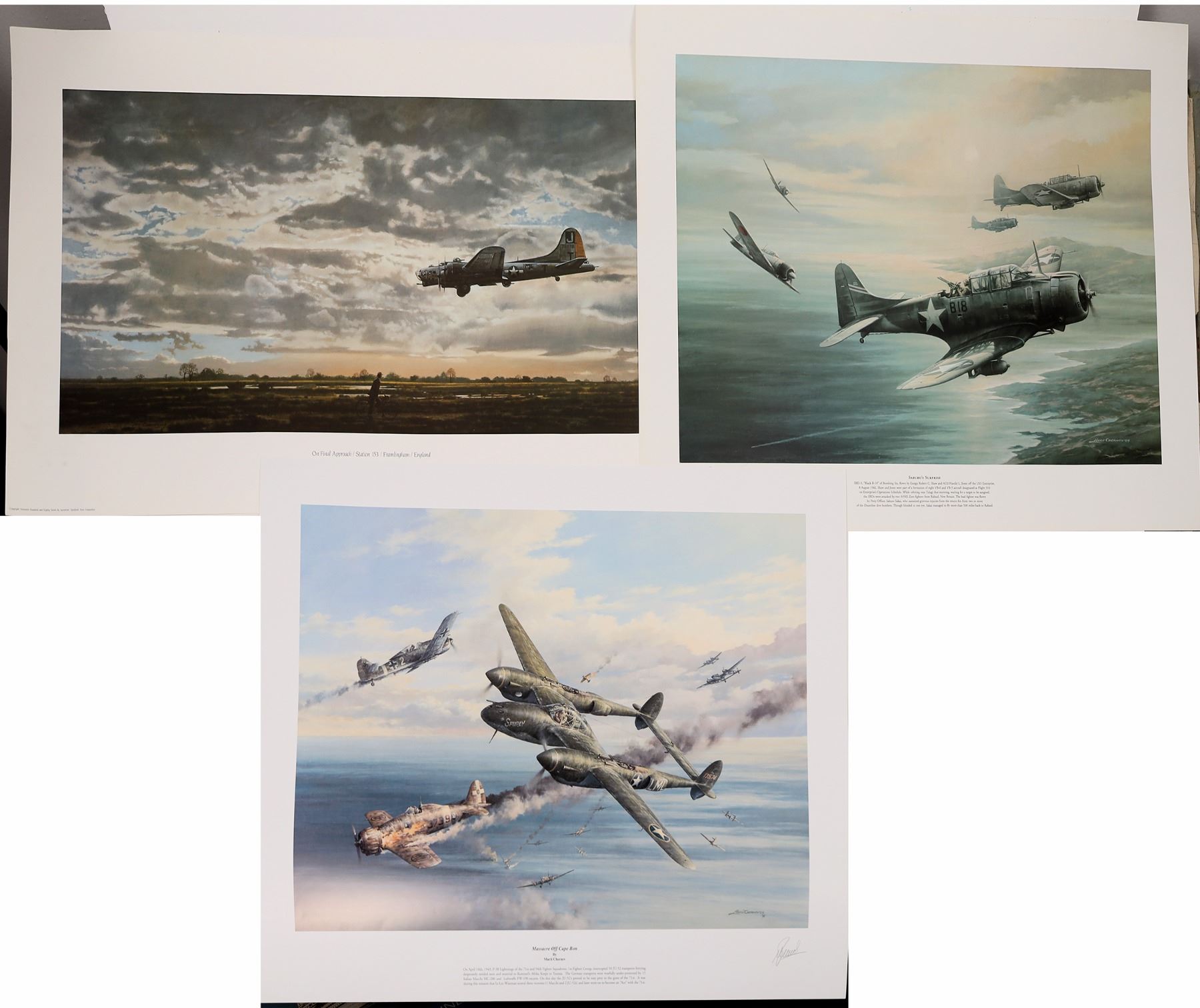 1.) Massacre Off Cape Bon by Marii Chernev. On April 10, 1943, P-38 Lightnings of the 71st & 94th Fighter Squadrons intercepts 50 JU-52 transports ferrying material to Rommel's Africa Korp in Tunisia & the Americans easily out-gun the 15 Italian Macchi MC-200's & German FW-190 escorts. Measure 29 wide x 23 inches high.